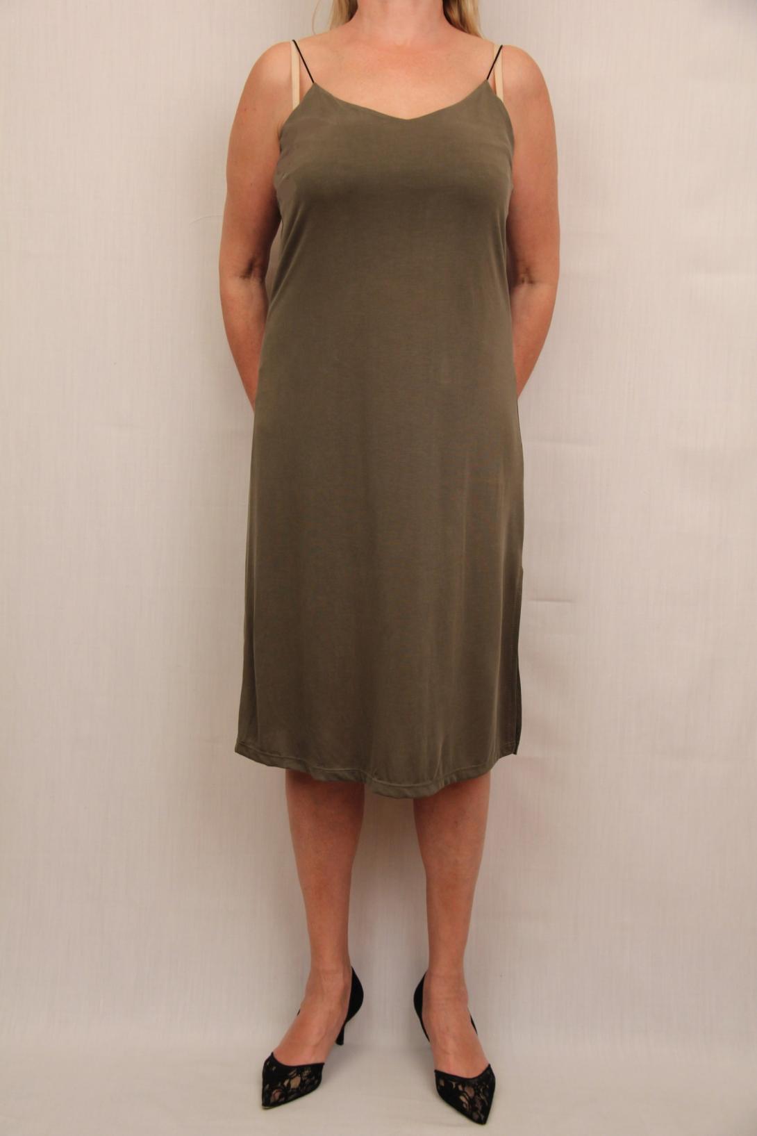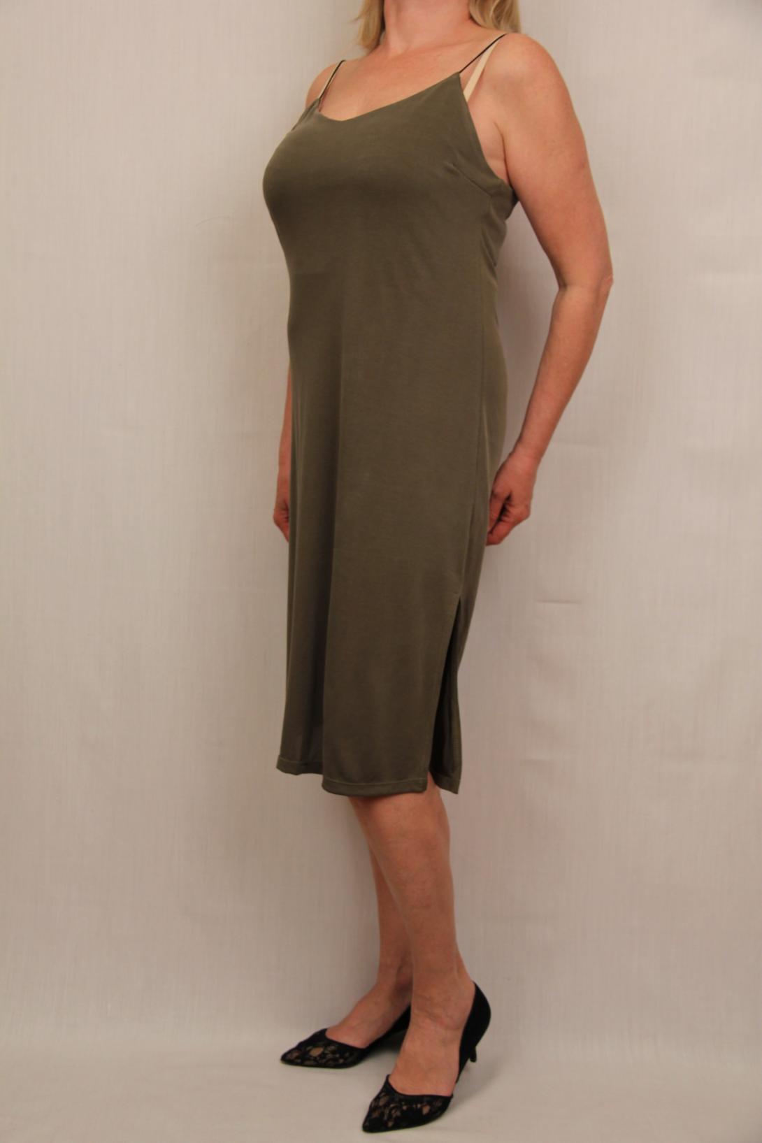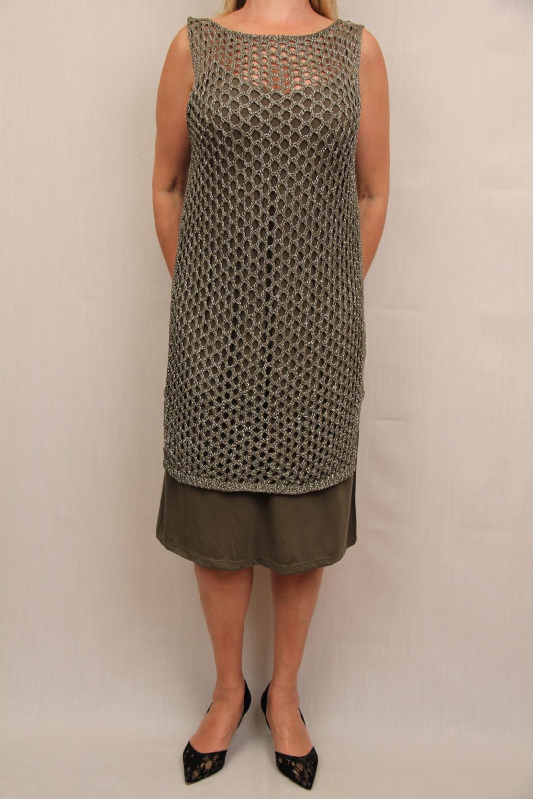 Трикотажный сарафан цвета хаки на тонких лямках. Платье отлично комплектуется с сеткой-туникой аналогичного цвета с ниткой люрекса.