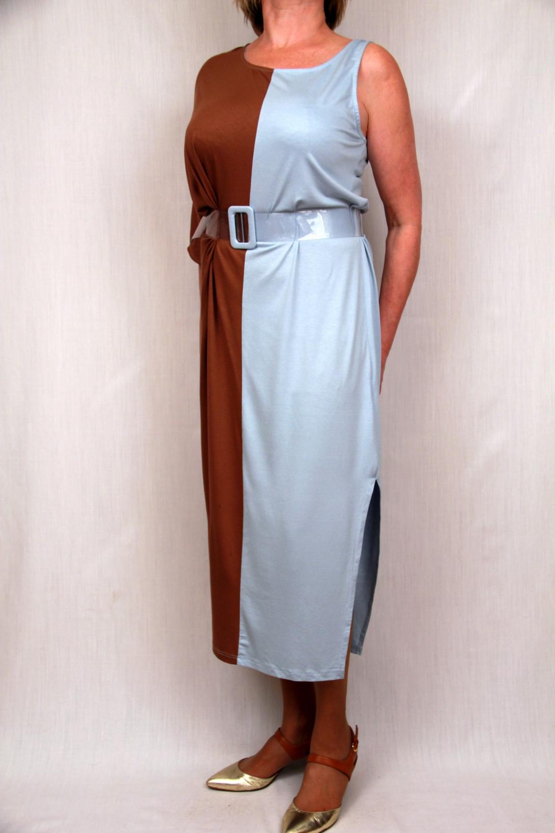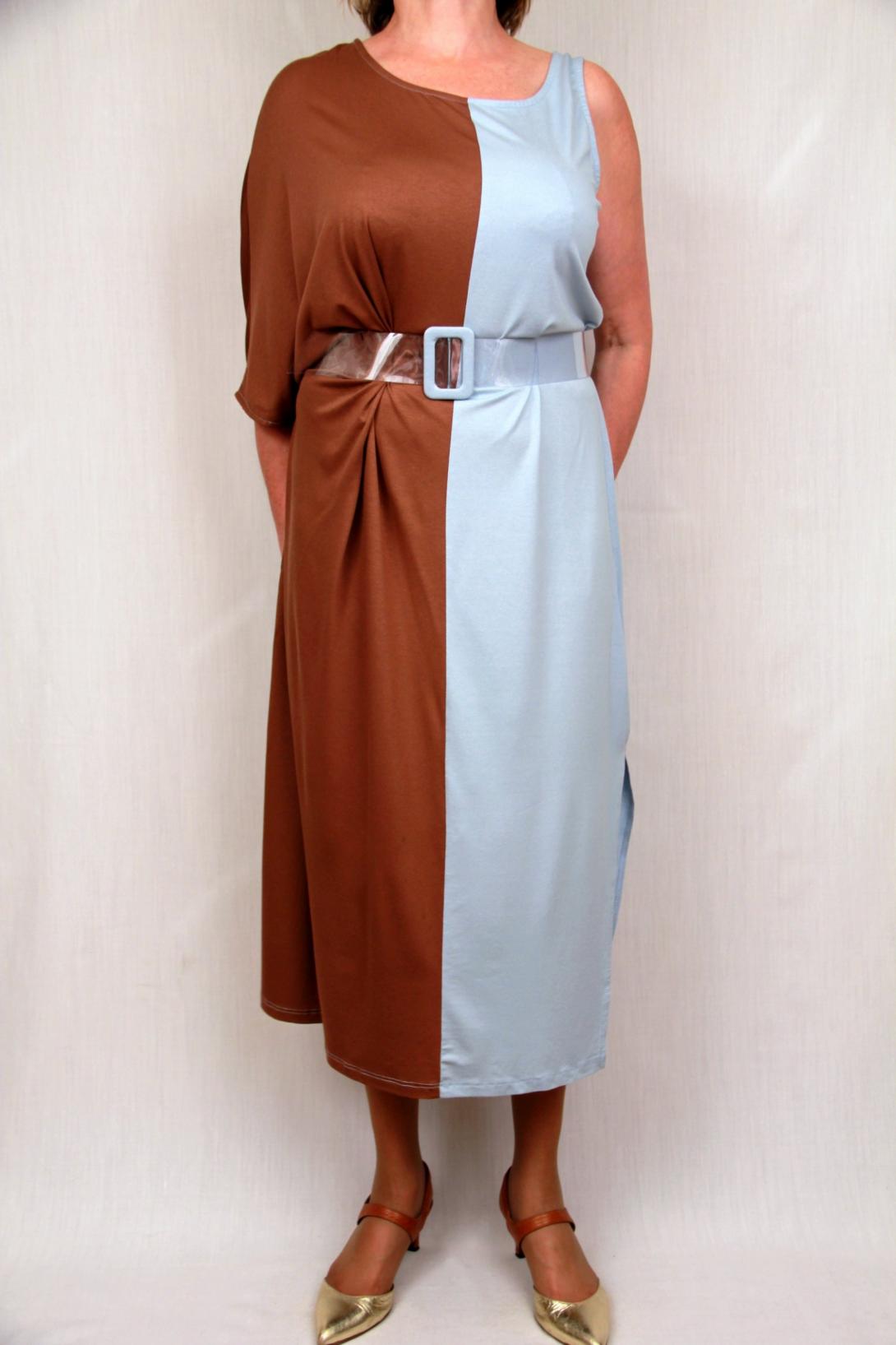 Остро модное ассиметричное платье. В комплекте к платью идет прозрачный ремень с голубой пряжкой. Платье нарядное.