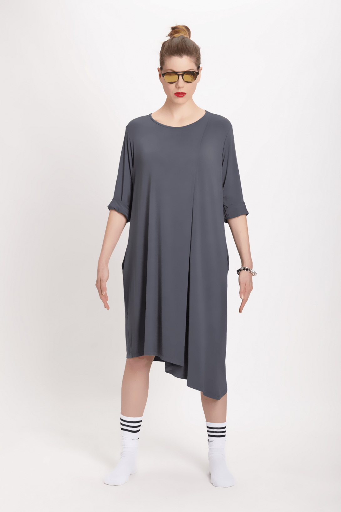 Платье с разнополой длинной из вискозного трикотажа . Платье красиво сидит по фигуре, если не обтягивает.В магазине вы можете купить только оливковый цвет.