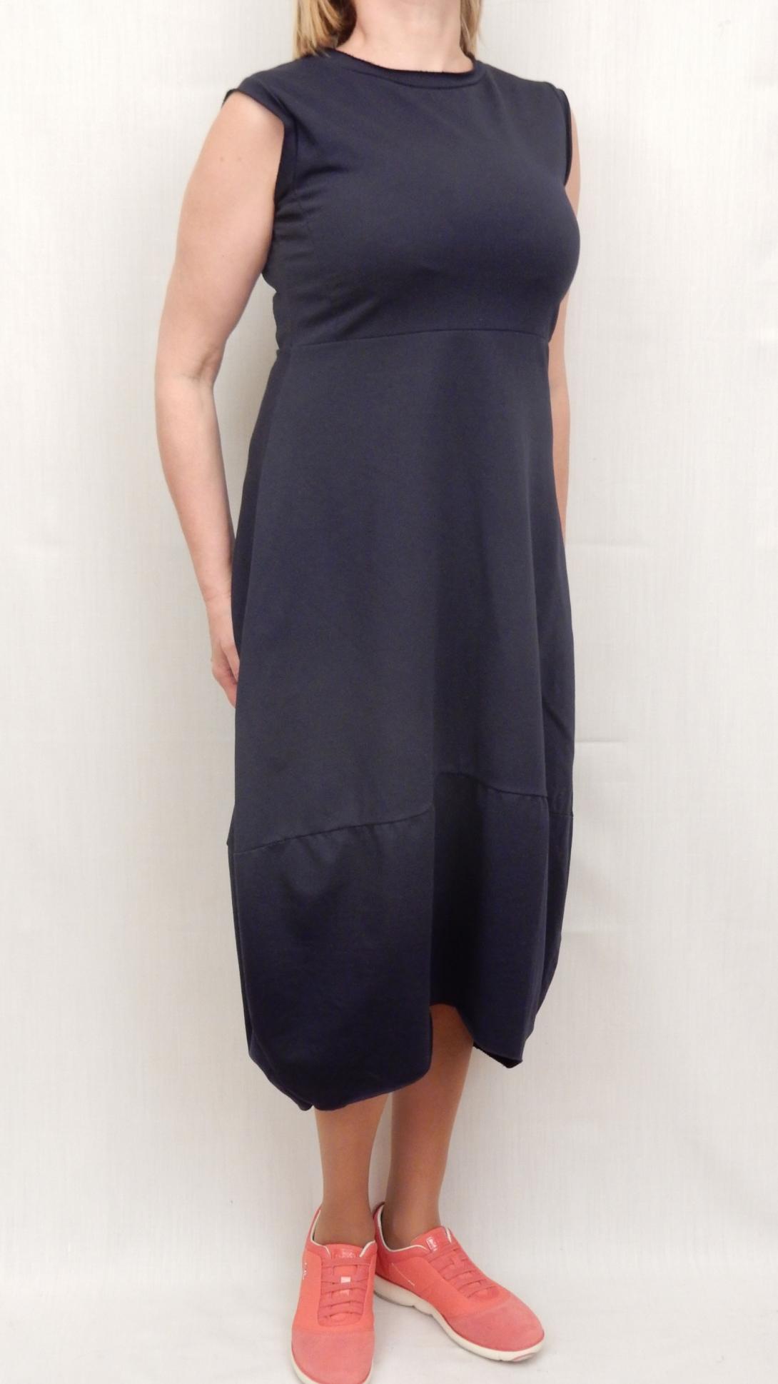 Тёмно-синее платье ниже колена, без рукавов, из тонкой фельпы, хорошо сидит по фигуре. Верх в обтяжечку..низ слегка балон.