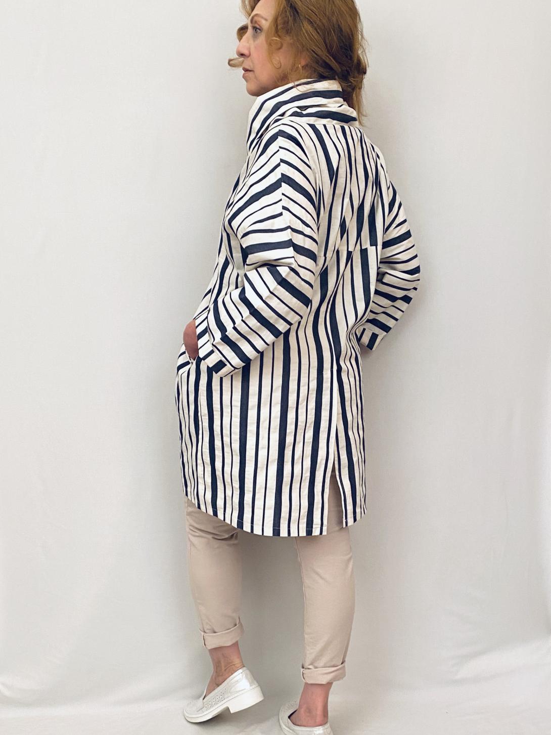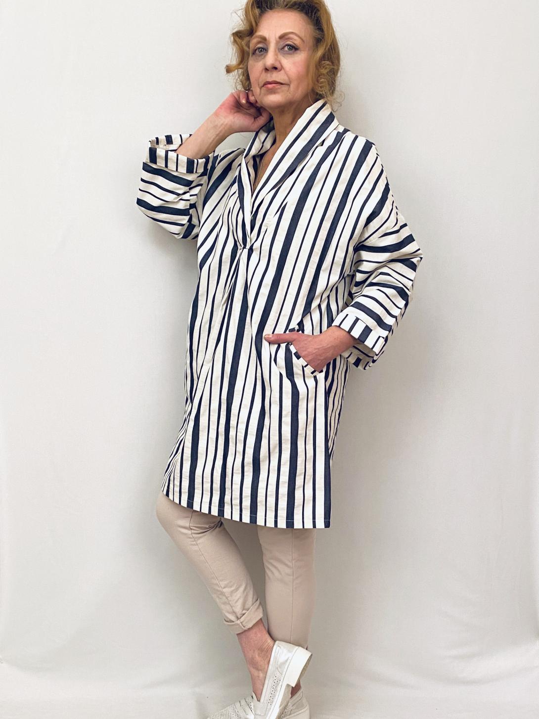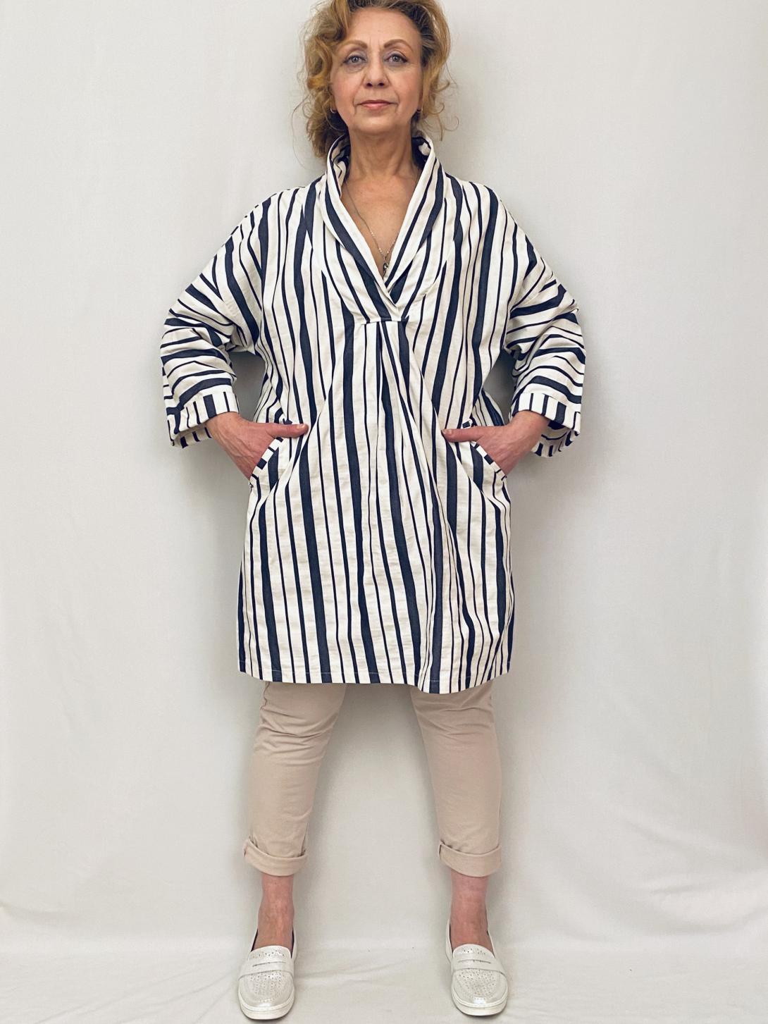 Стильное платье в крупную полоску. Сзади глубокая шлица.Платье отлично комплектуется с джинсами или трикотажными брюками от Wendy Trendy.