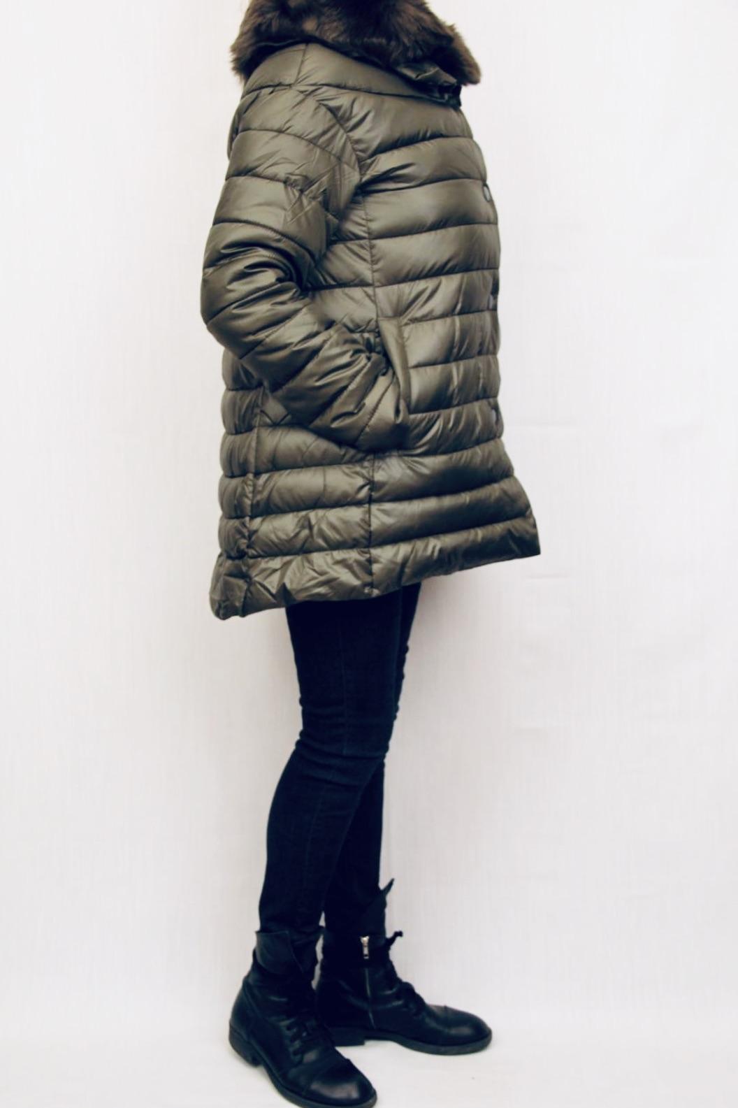Куртка изготовлена из плащевой ткани, утеплена синтепоном. Имеет слегка спущенную линию плеча и трапециевидный силуэт. Длина куртки средняя, а минимальная температура использования составляет -15 градусов.