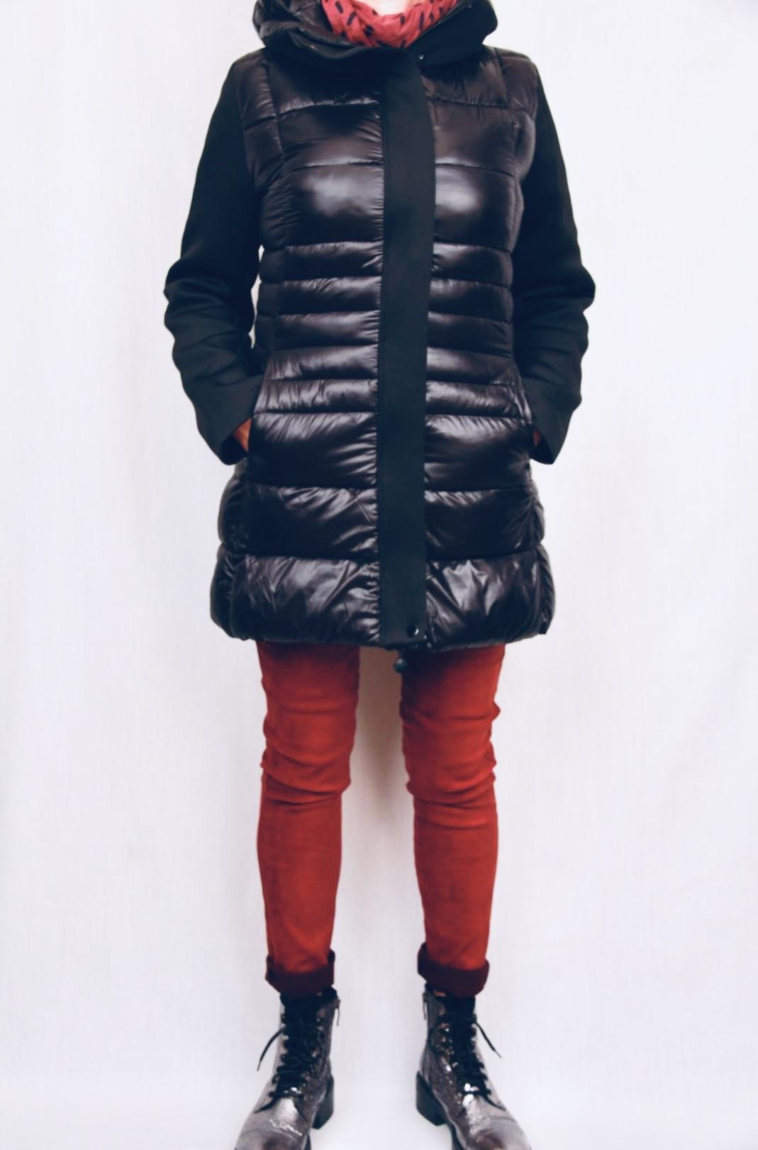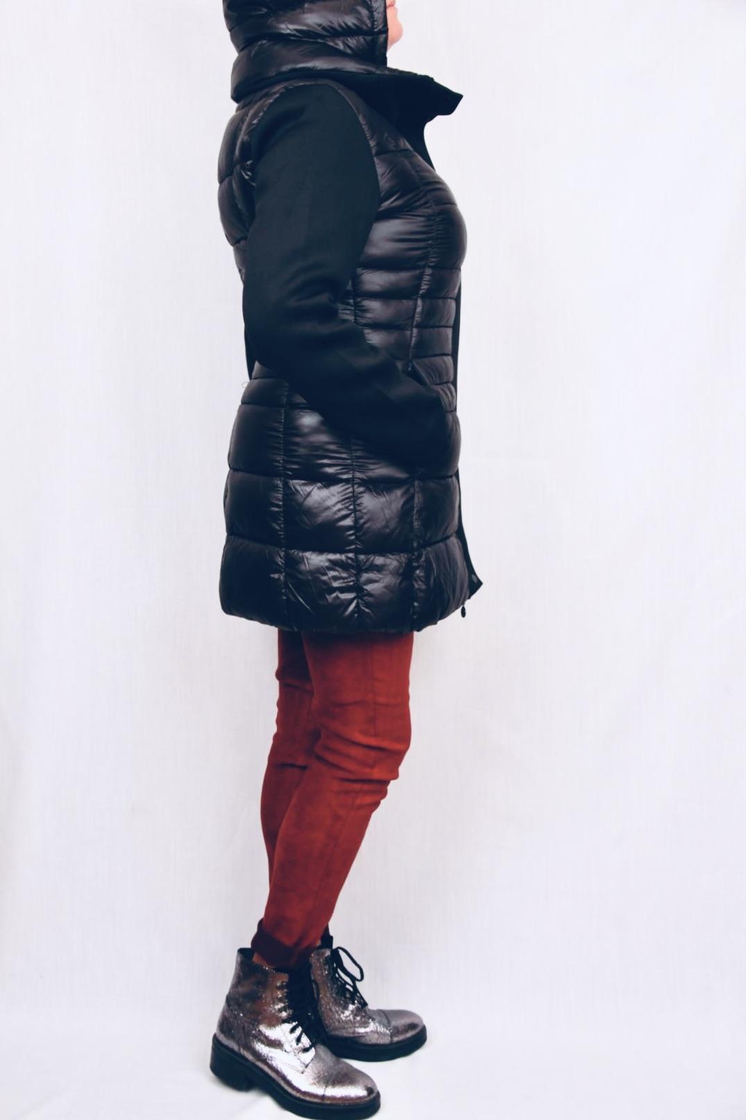 Стильная чёрная комбинированная куртка с капюшоном. Куртка сидит по фигуре и закрывает бёдра.Куртка тёплая.