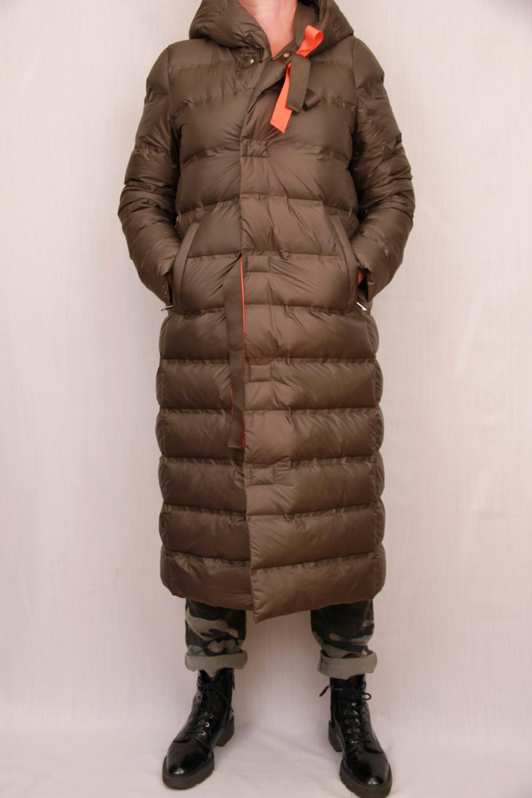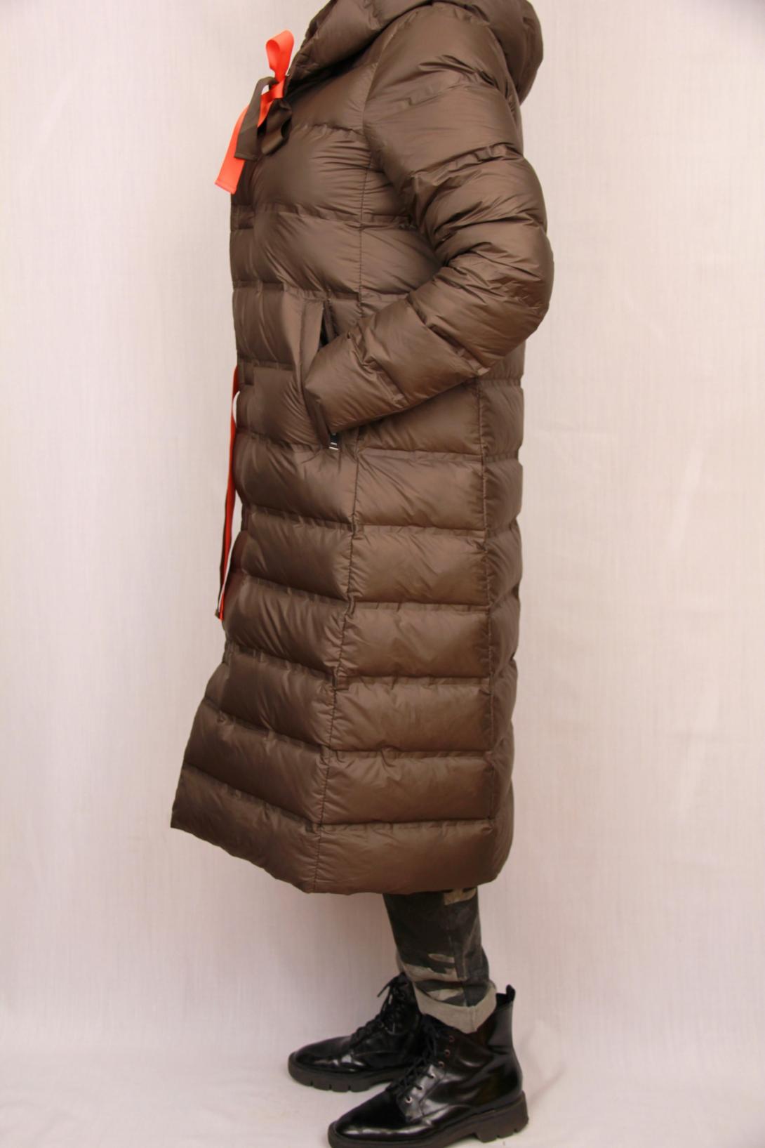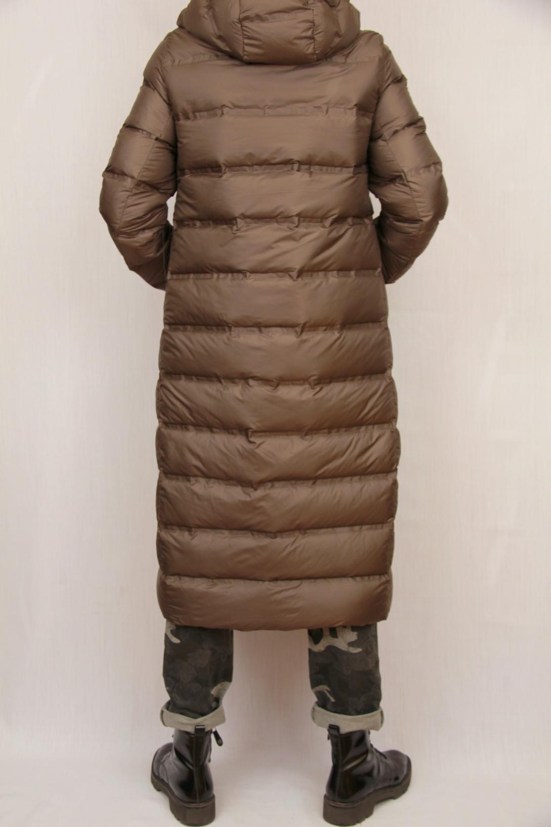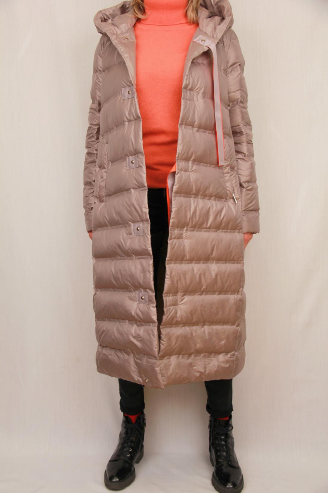 Бежевый пуховик с капюшоном ниже колена. Пуховик имеет застёжки-кнопки, что очень удобно. По бокам у пуховика есть карманы на молнии.