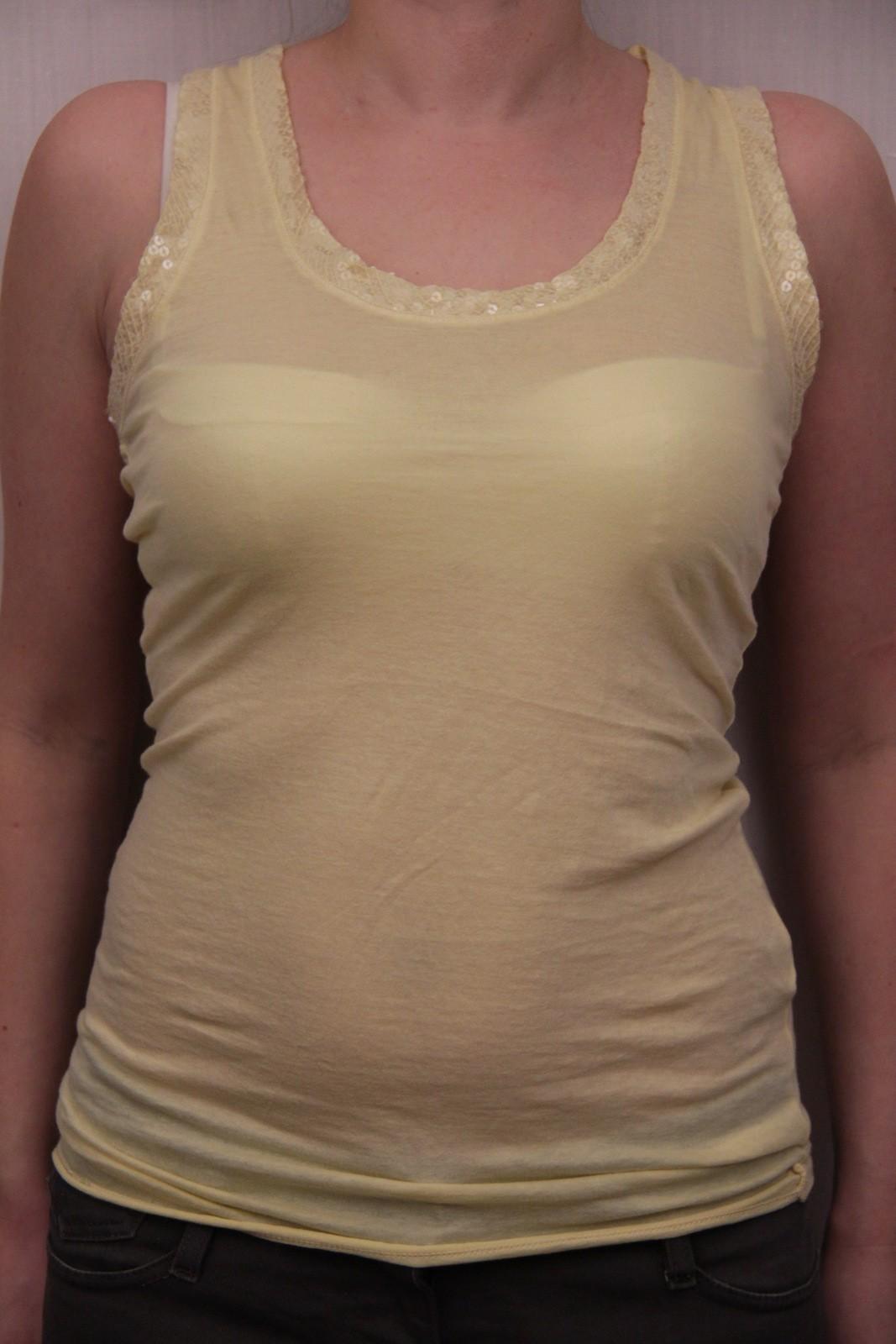Борцовка расшитая поетками по краю бретелек. Топ из 100% хлопка бежевого цвета, разбелённого жёлтого и цвета фукси.