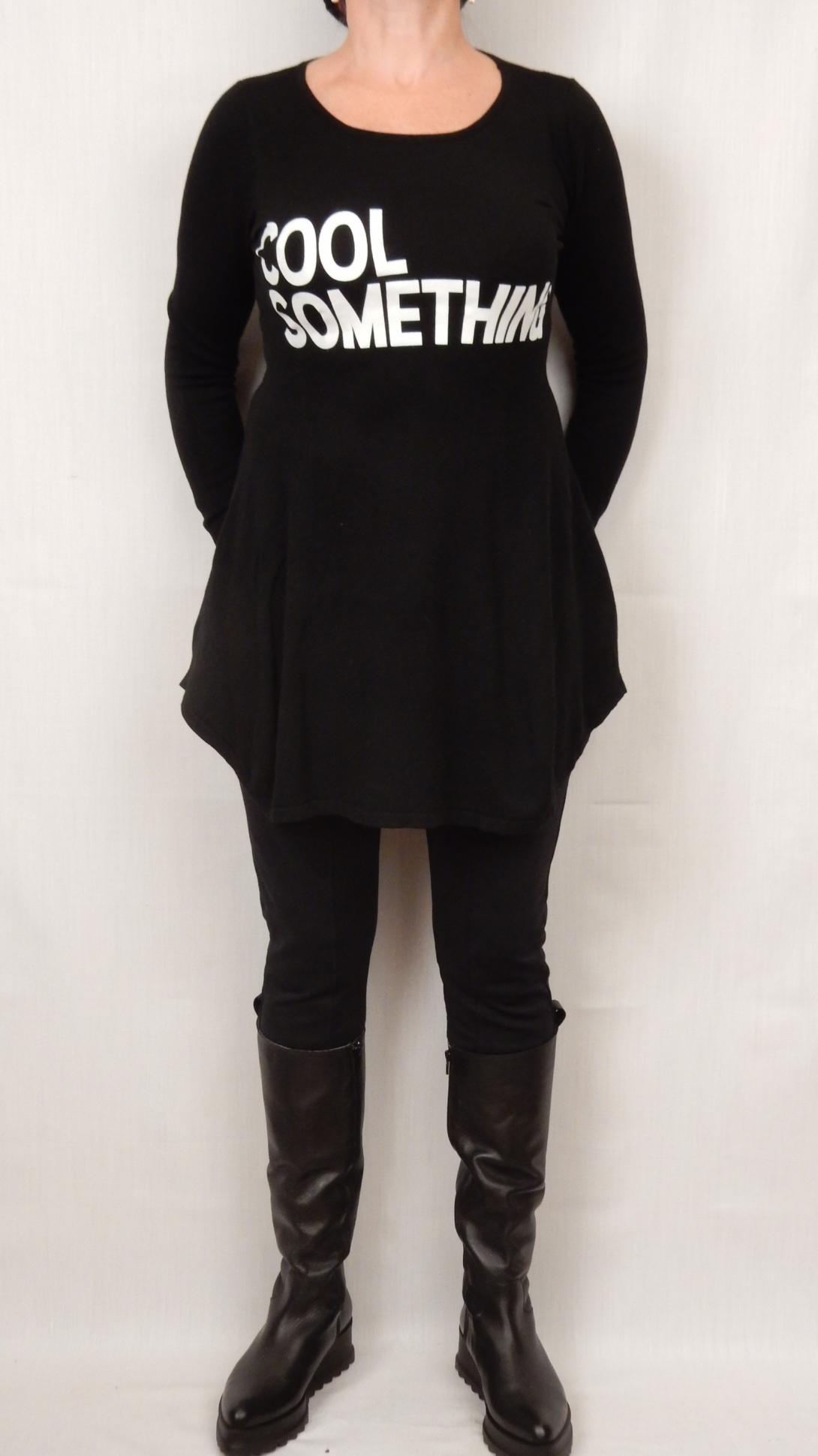 Трикотажная туника легко комбинируется с узкими брюками или джинсами. Туника чёрного цвета с белыми буквами. Сезонные скидки. Купить только в интернет магазине по низкой цене 2590 рублей.