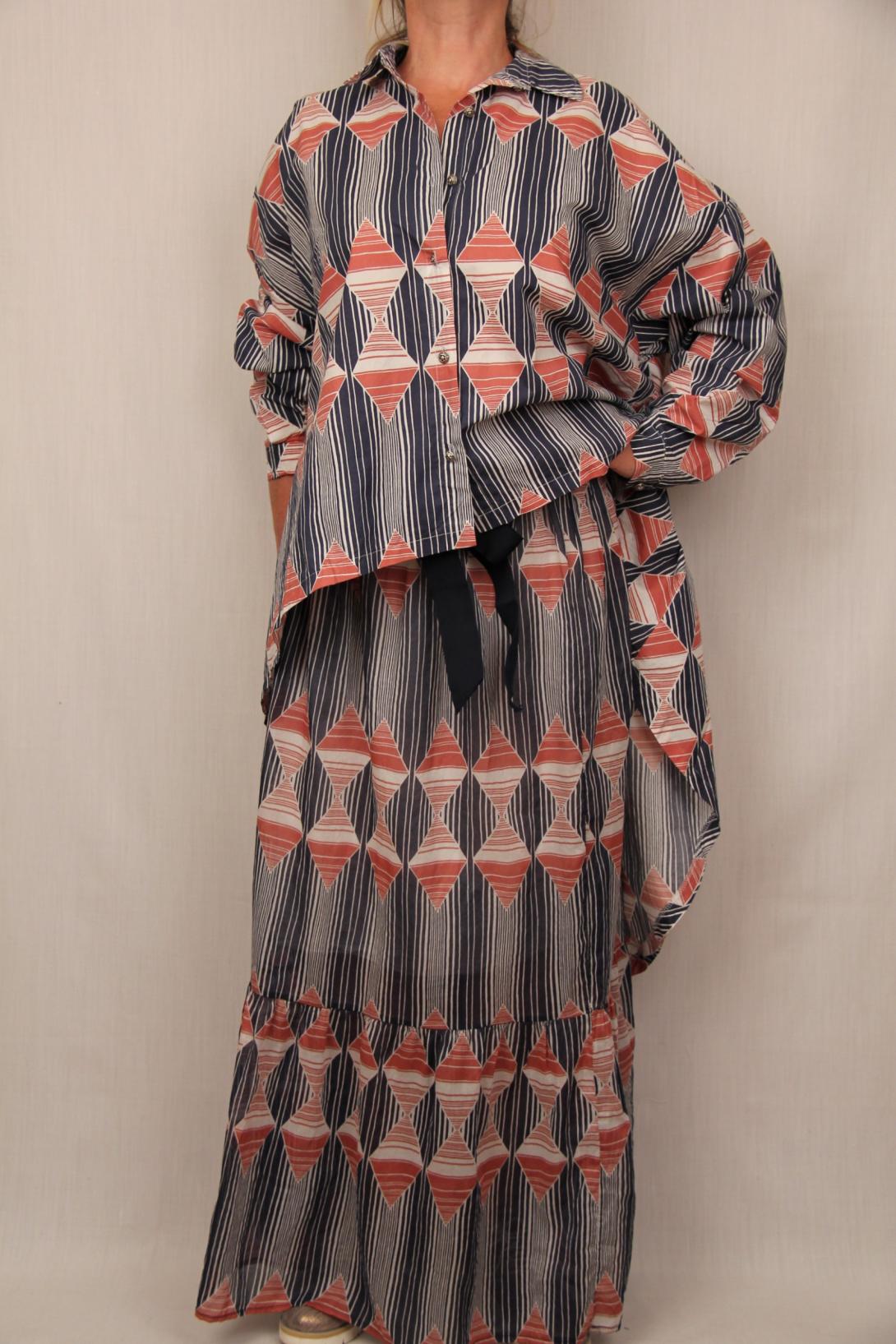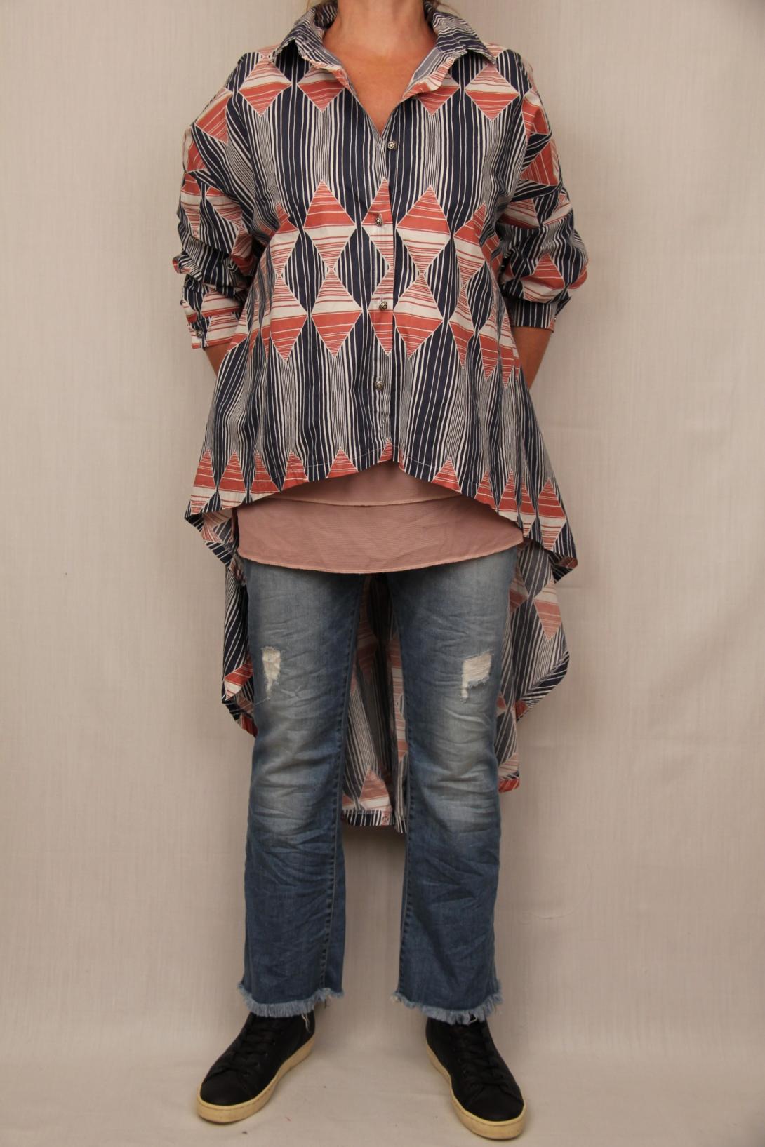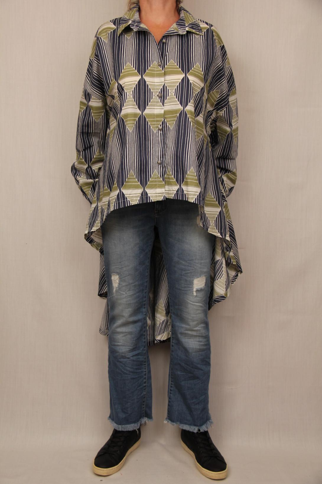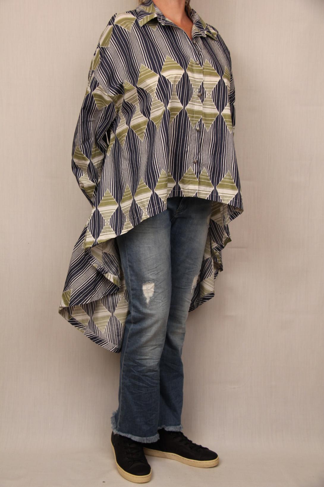 Шикарная блузка большого размера свободного кроя с красивым рукавом. Разновеликий подол закрывает не только бёдра, но и ноги. Рубашка такого плана легко комплектуется как с узкими брюками, так и с широкими юбками. Одежда большого размера купить в интернет магазине со скидкой.