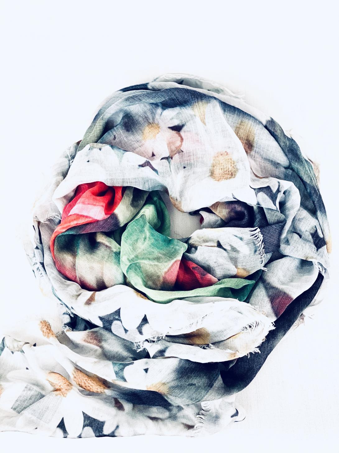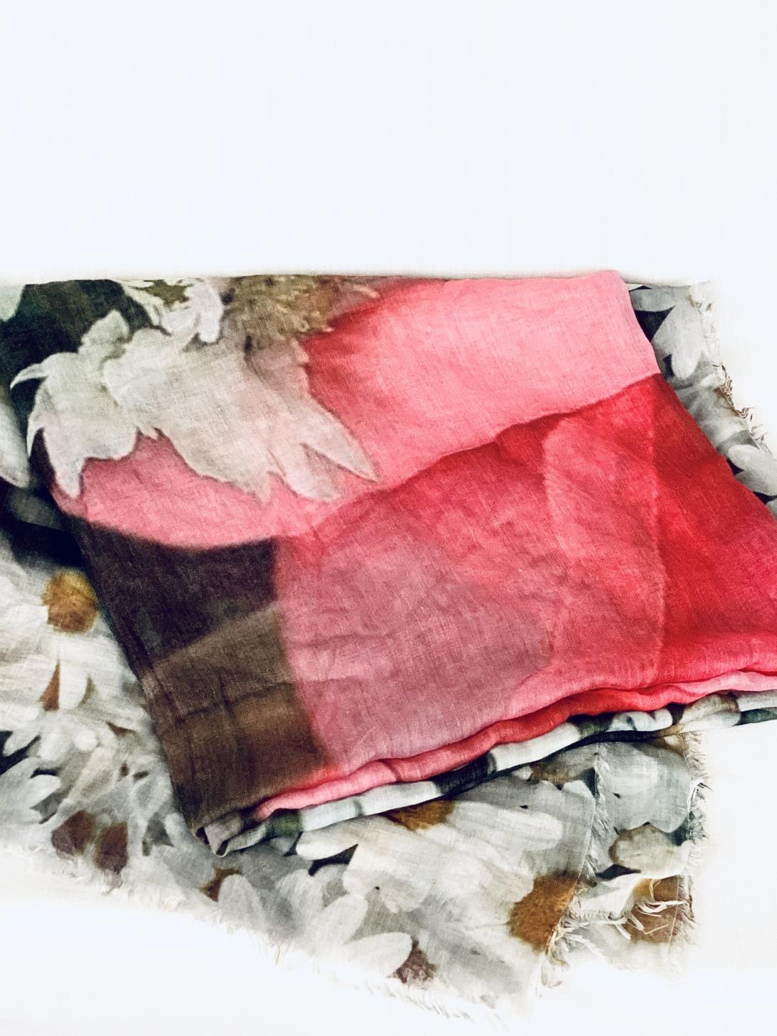 Разнообразие цветов: платок выполнен в мультиколорном дизайне, сочетающем в себе бежевый, красный, коралловый, зеленый, фуксию и розовый цвета.