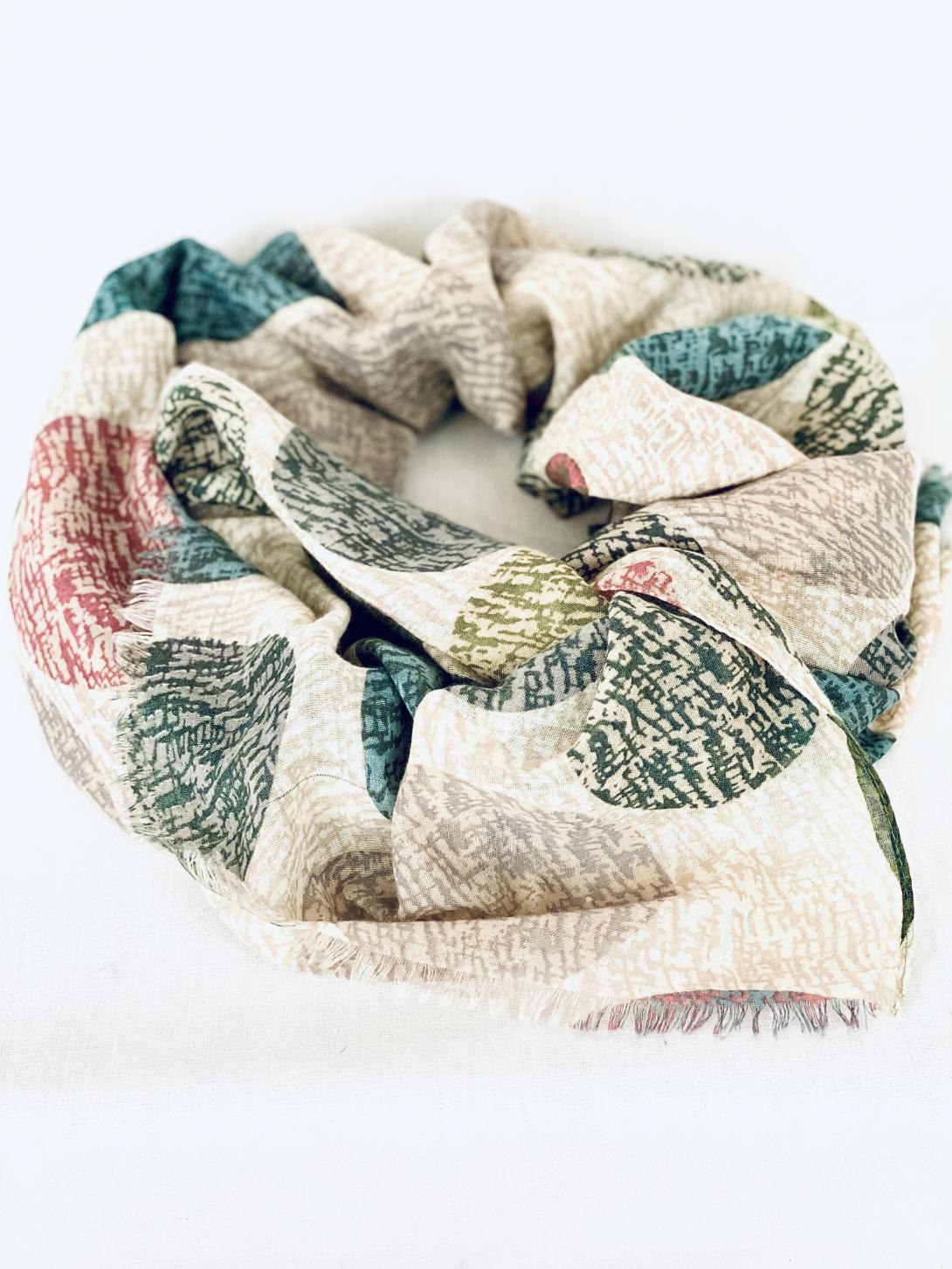 Палантин выполнен в бежевом цвете с принтом в горошек, что делает его актуальным и модным аксессуаром.