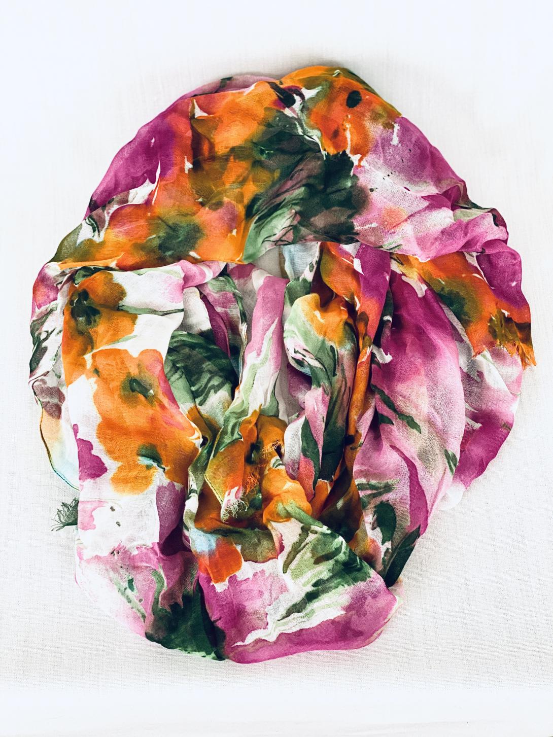 Палантин представлен в мультиколорном дизайне с яркими коралловым, красным и оранжевым цветами. Флористический принт добавляет изделию оригинальности и стиля.