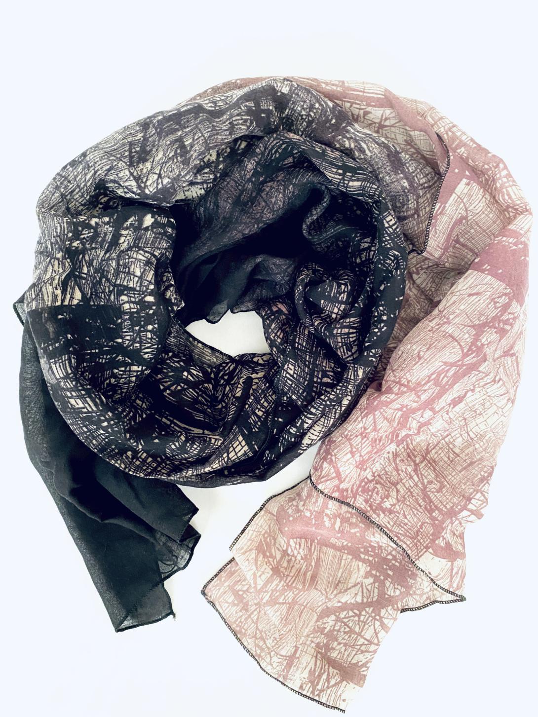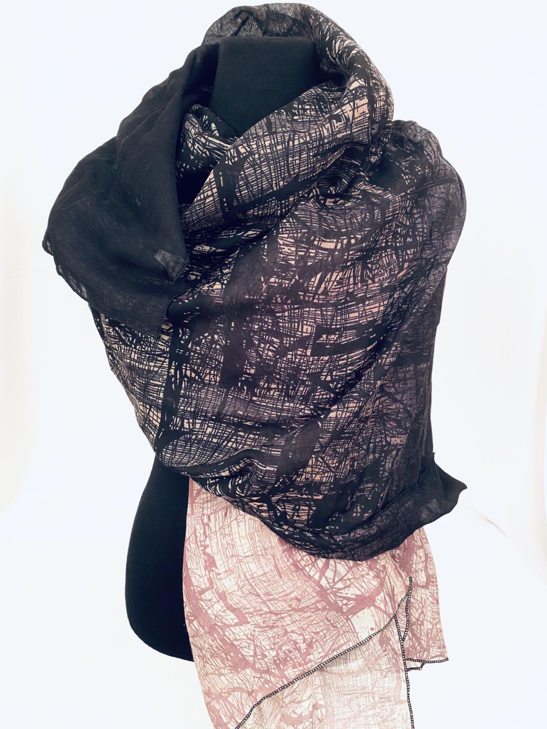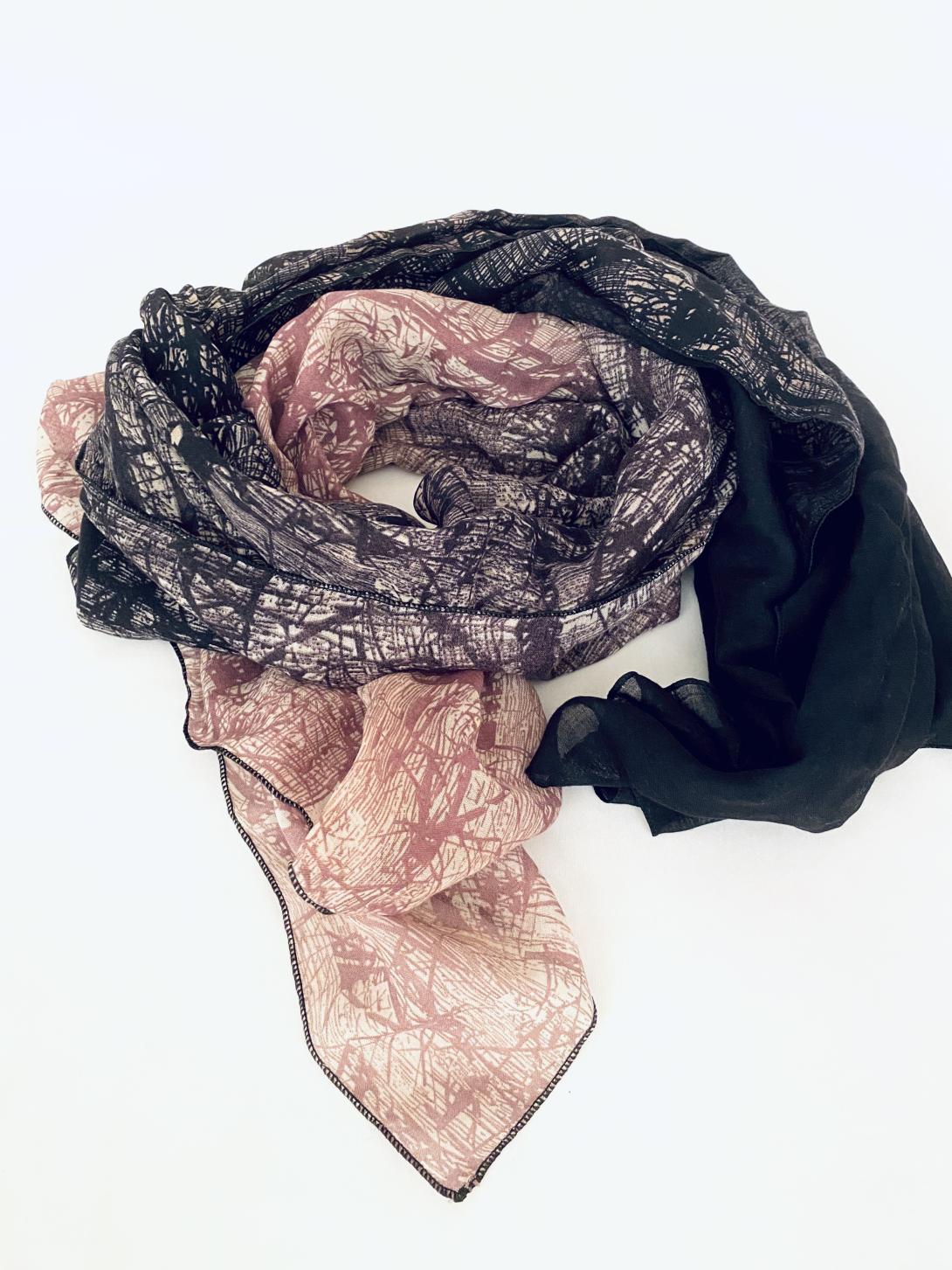 Палантин с переходом цвета: черным и пыльной розы. Черный цвет универсален и легко сочетается с другими цветами, а пыльная роза добавляет изысканности и утонченности образу.
