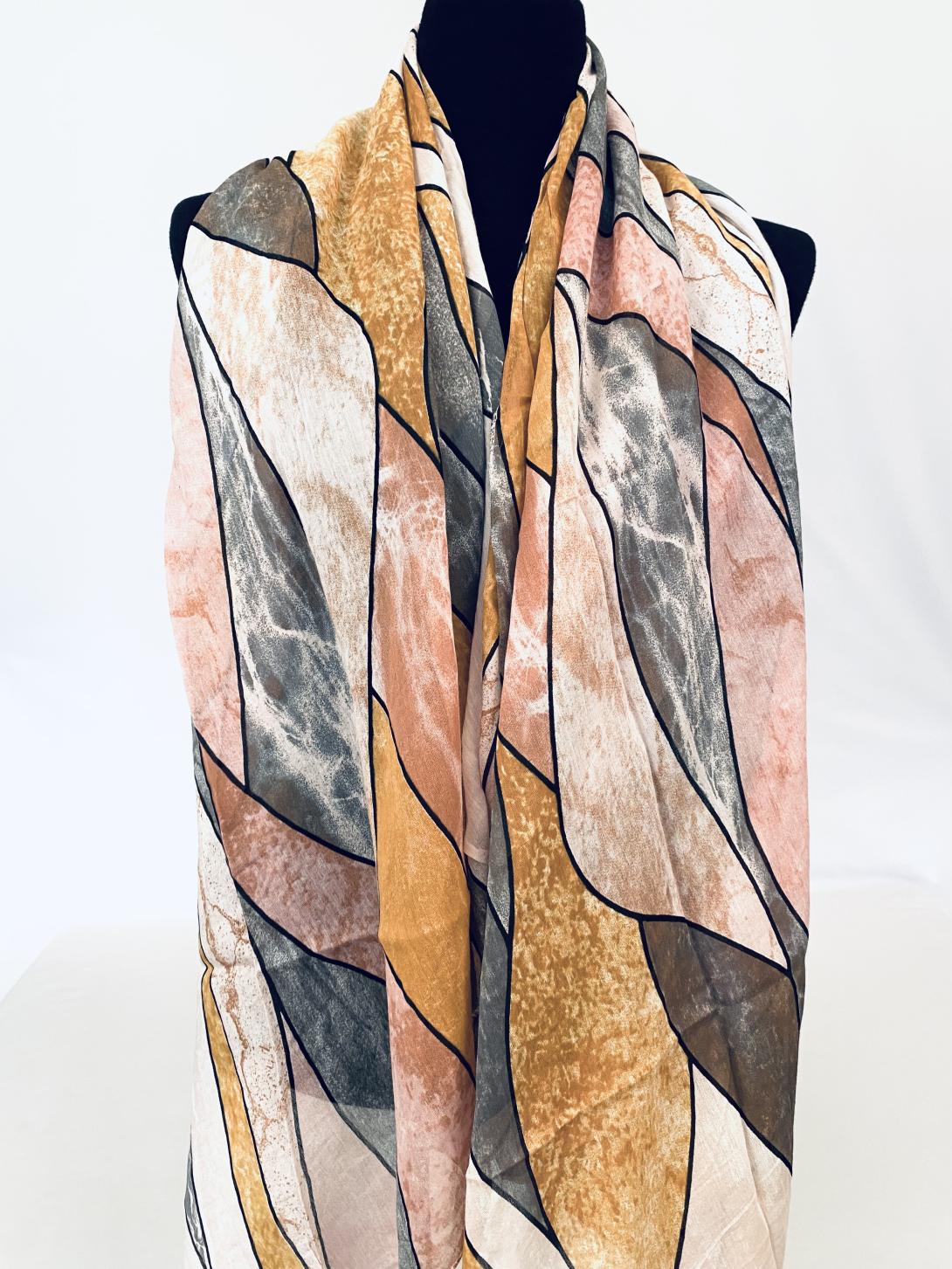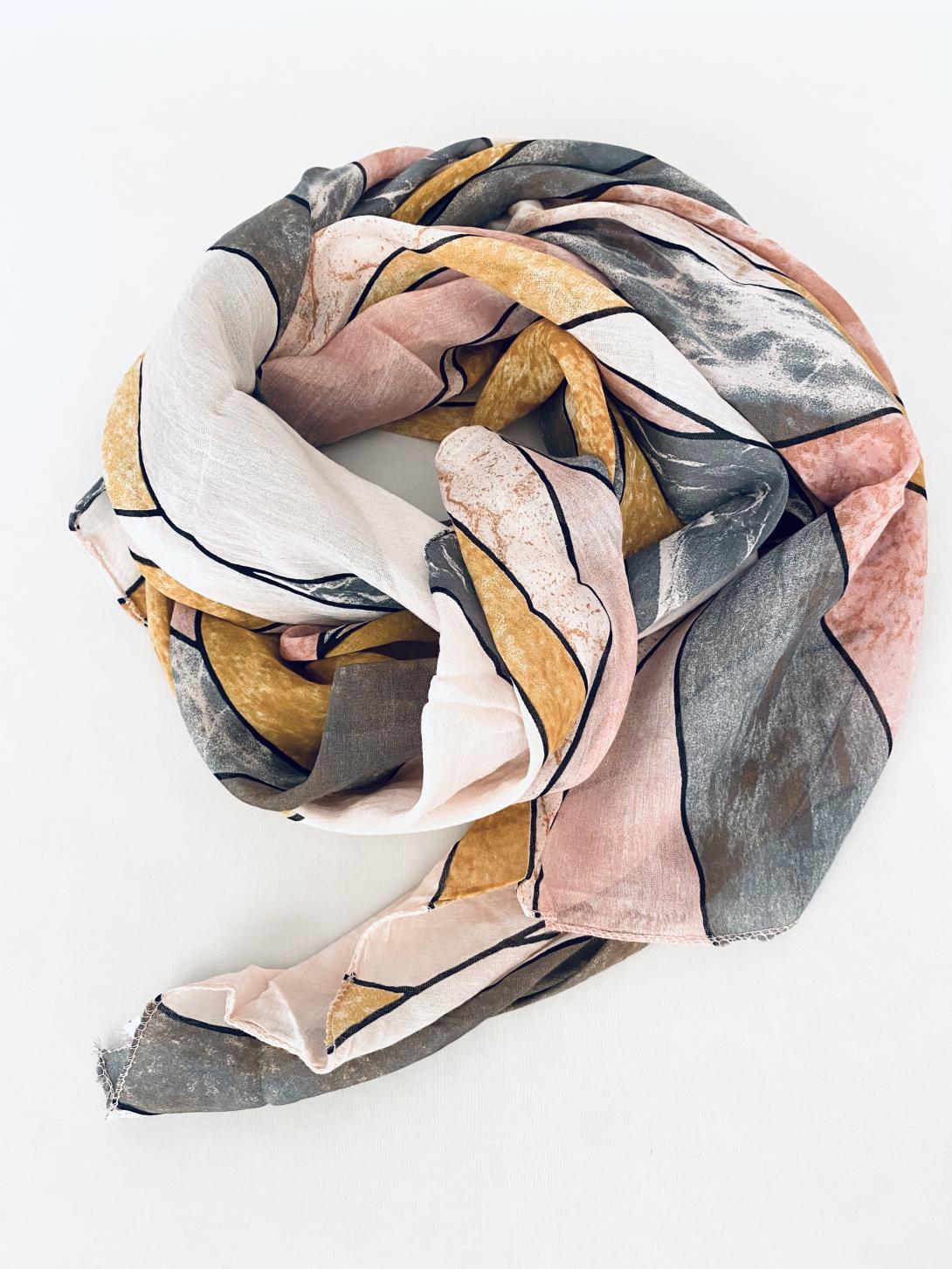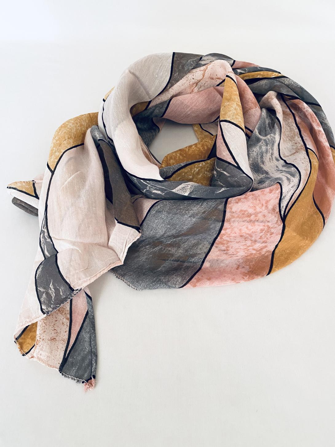 Асимметричный дизайн шарфа придает ему оригинальность и уникальность. Абстрактный принт в розовых, синих и зеленых тонах делает его ярким и запоминающимся.