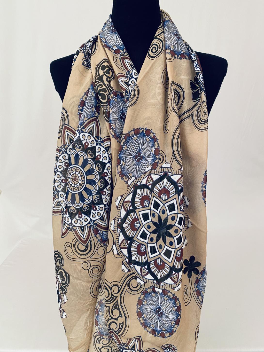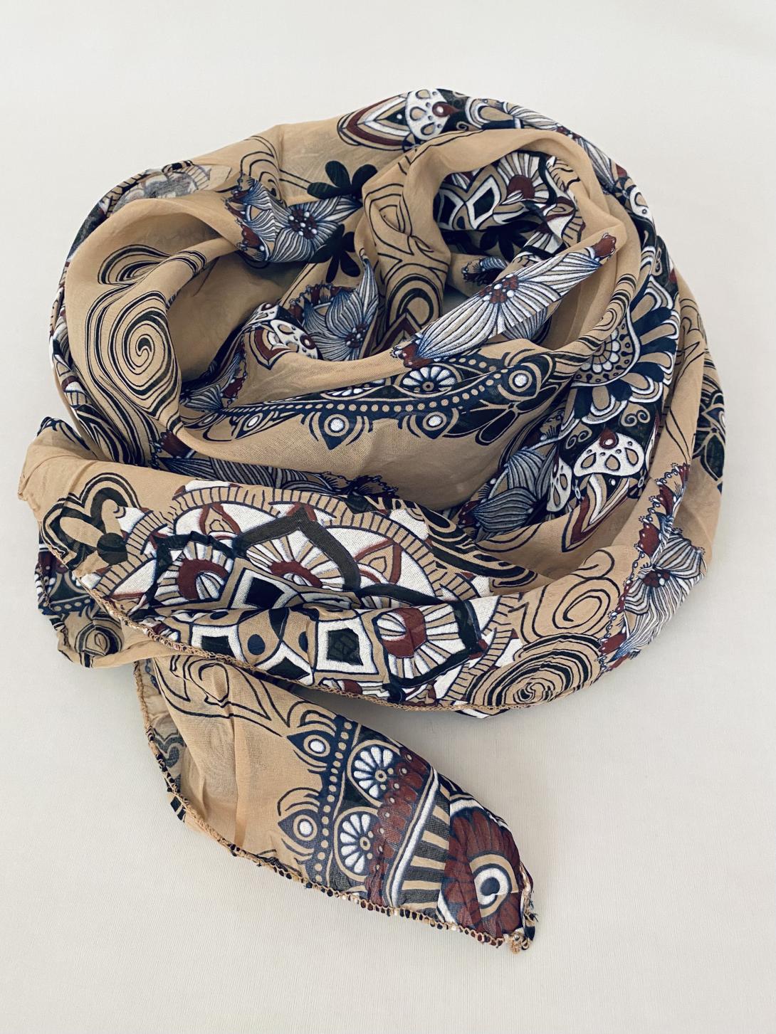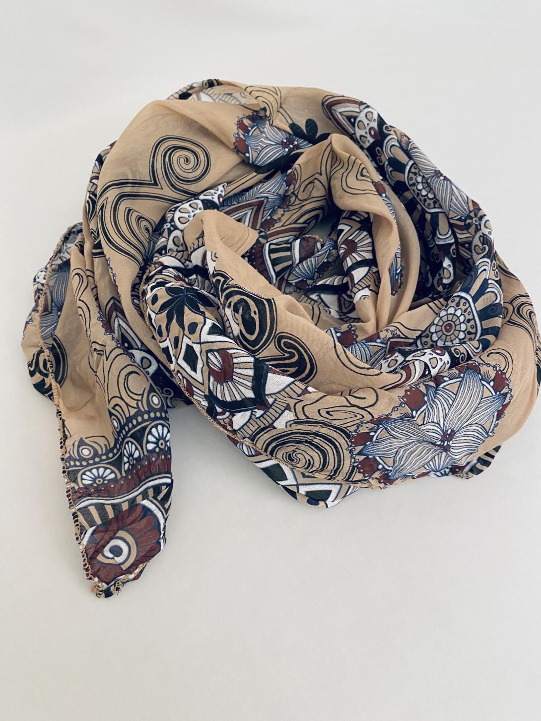 Асимметричный дизайн и принт придают шарфу уникальность и оригинальность. Разноцветный принт в бежевых тонах выглядит стильно и модно.
