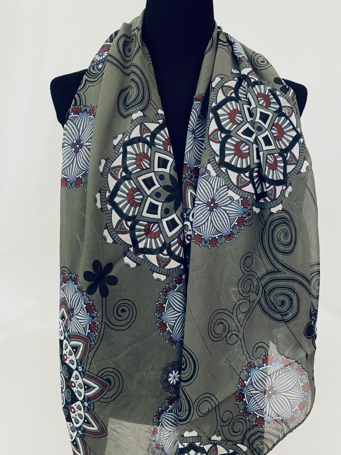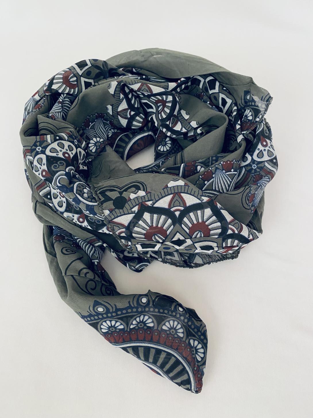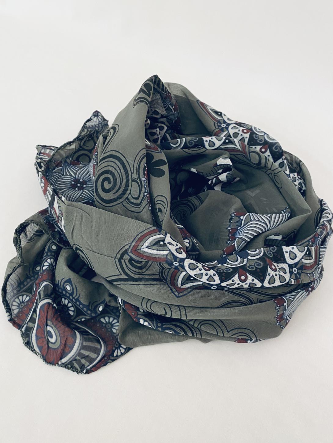 Асимметричный дизайн и принт придают шарфу уникальность и оригинальность. Разноцветный принт в зеленых тонах выглядит стильно и модно.