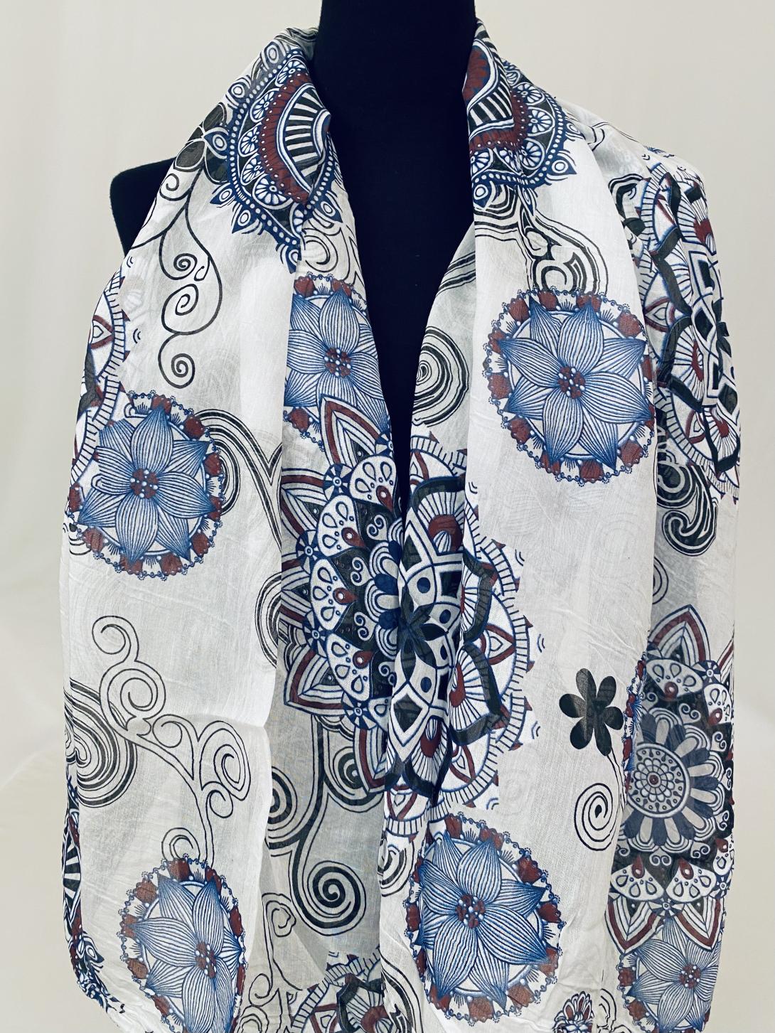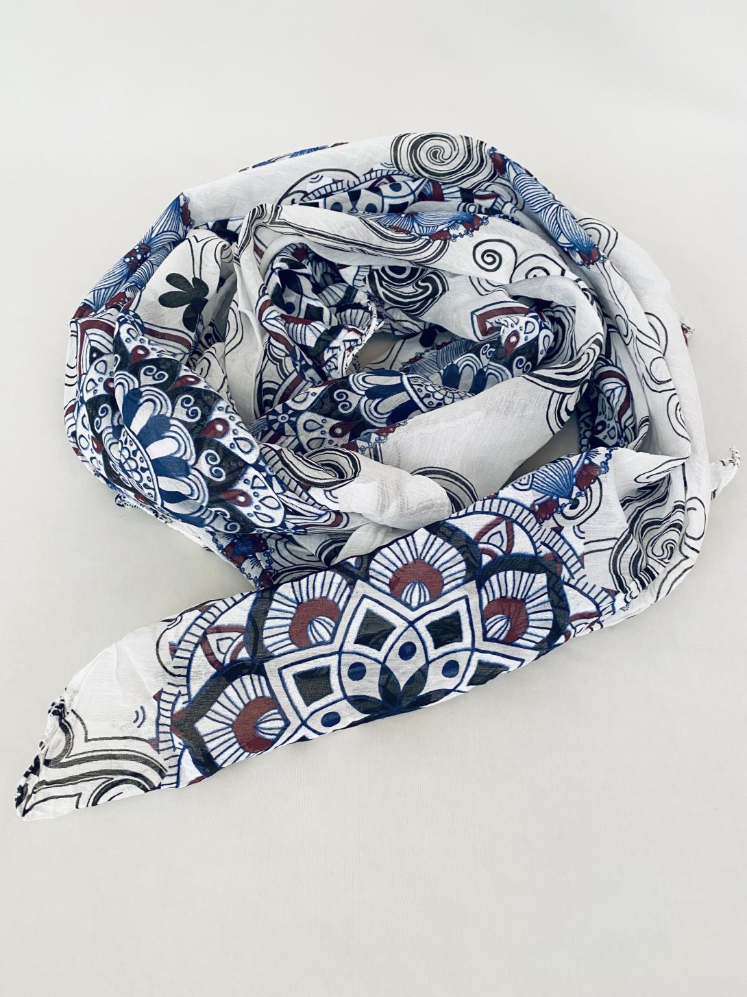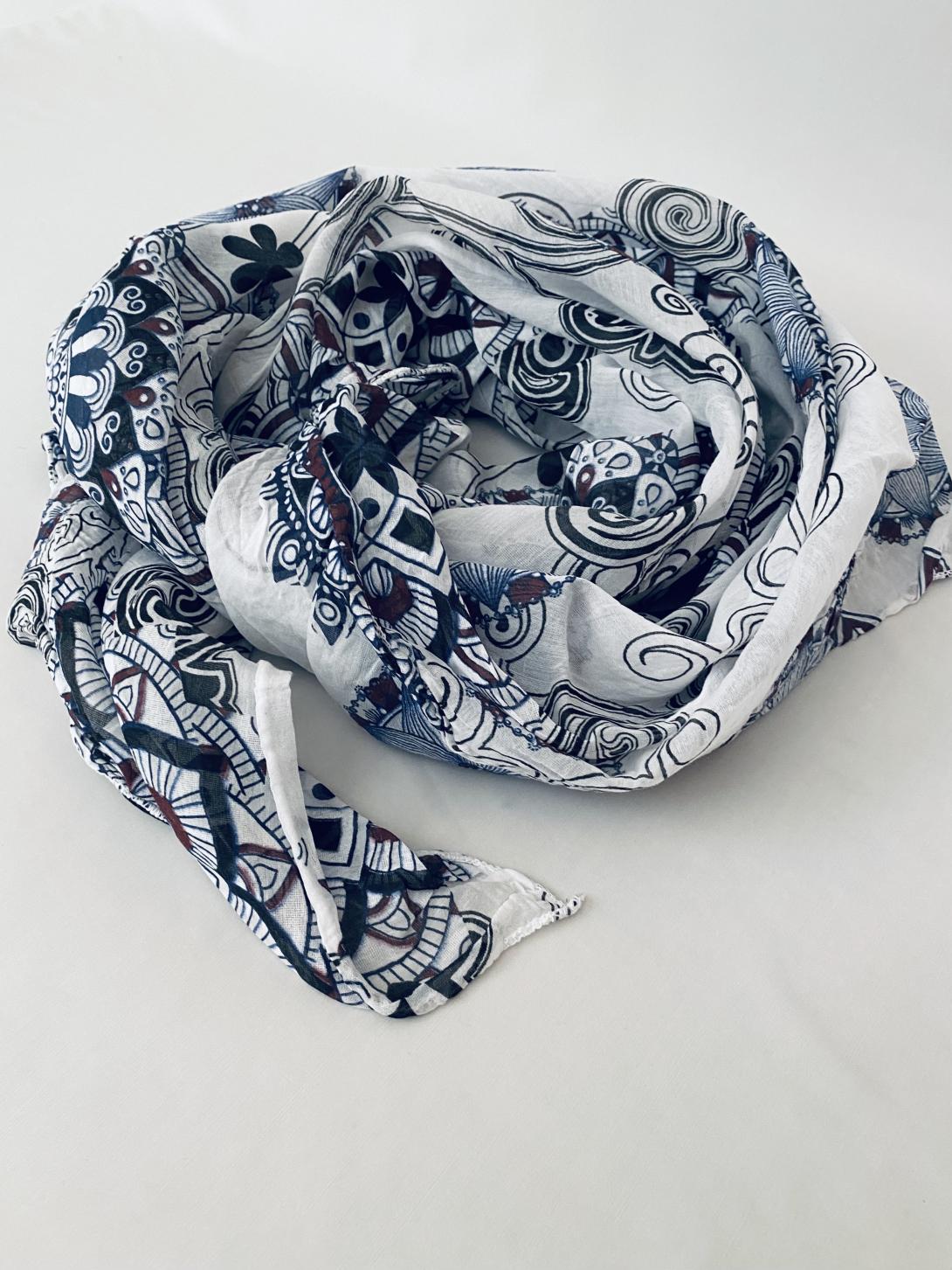 Асимметричный дизайн и принт придают шарфу уникальность и оригинальность. Разноцветный принт в белых тонах выглядит стильно и модно.