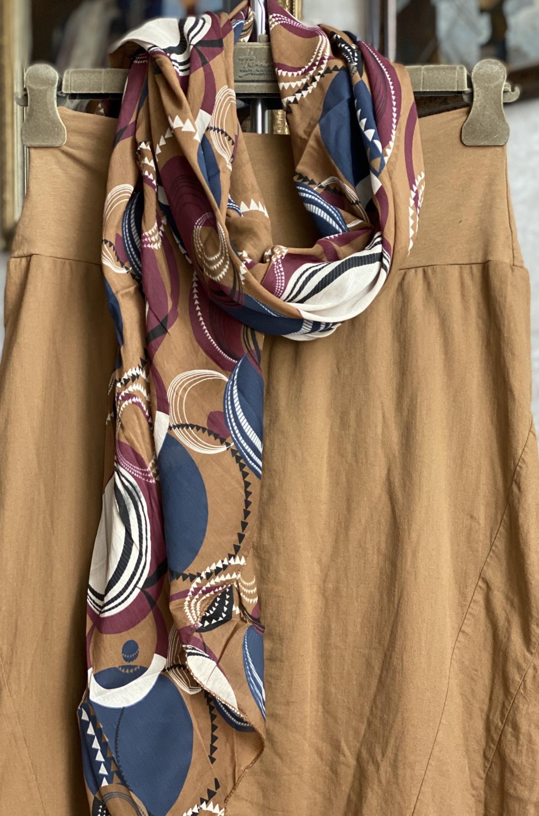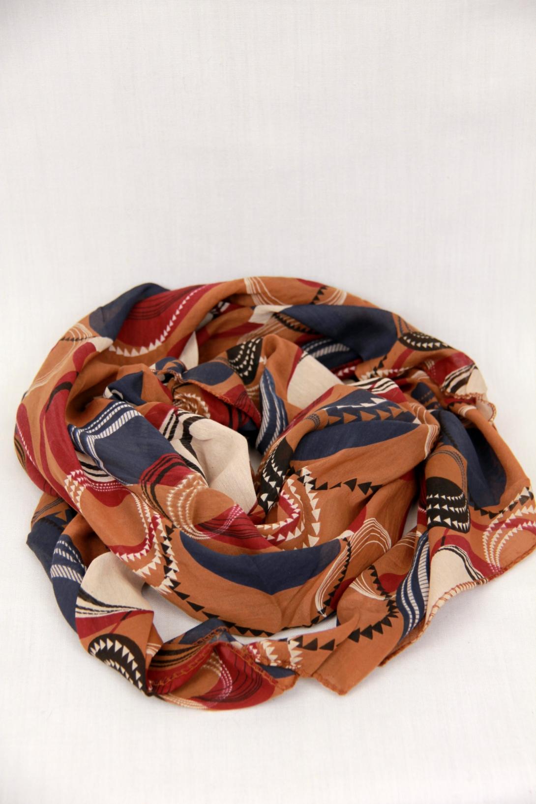 Ассиметричный дизайн шарфа придает ему оригинальность и неповторимость. В наличии три цвета: коричневый, бордовый и голубой. Принт в виде абстрактного и геометрического узора делает шарф еще более привлекательным.