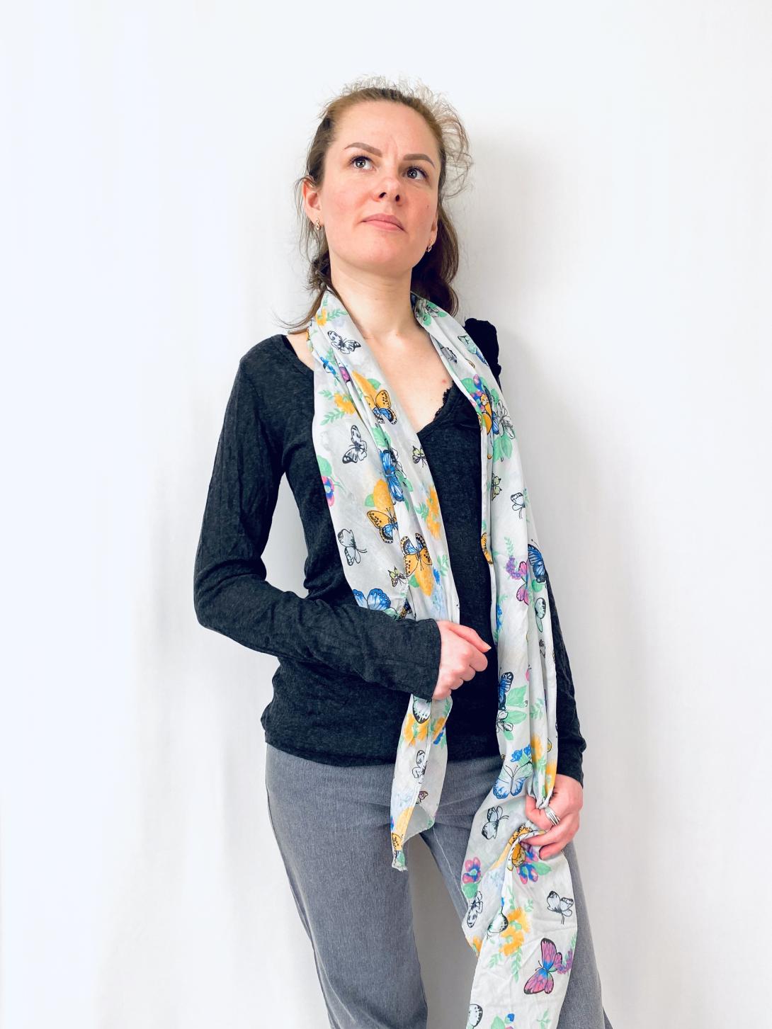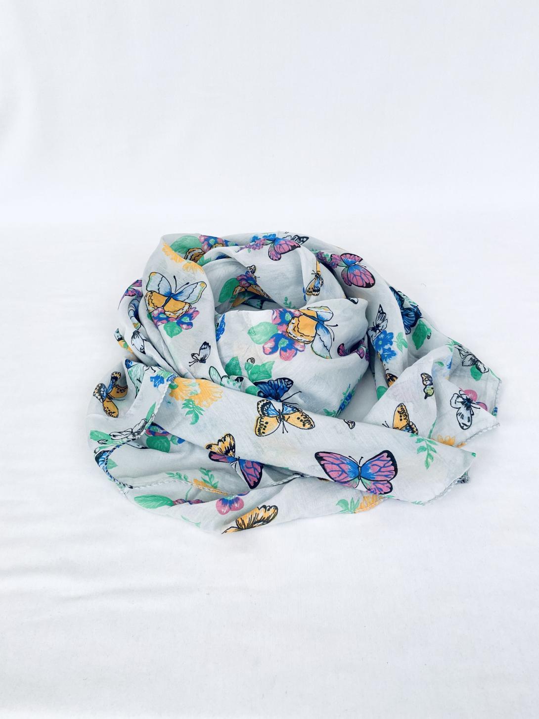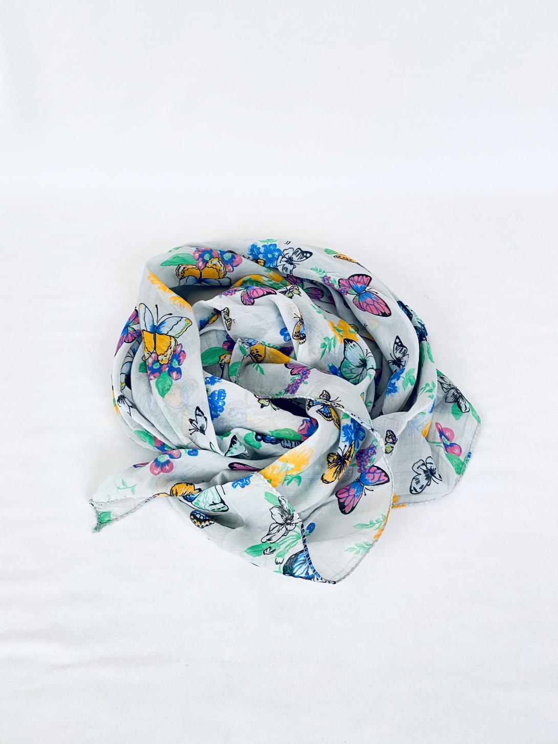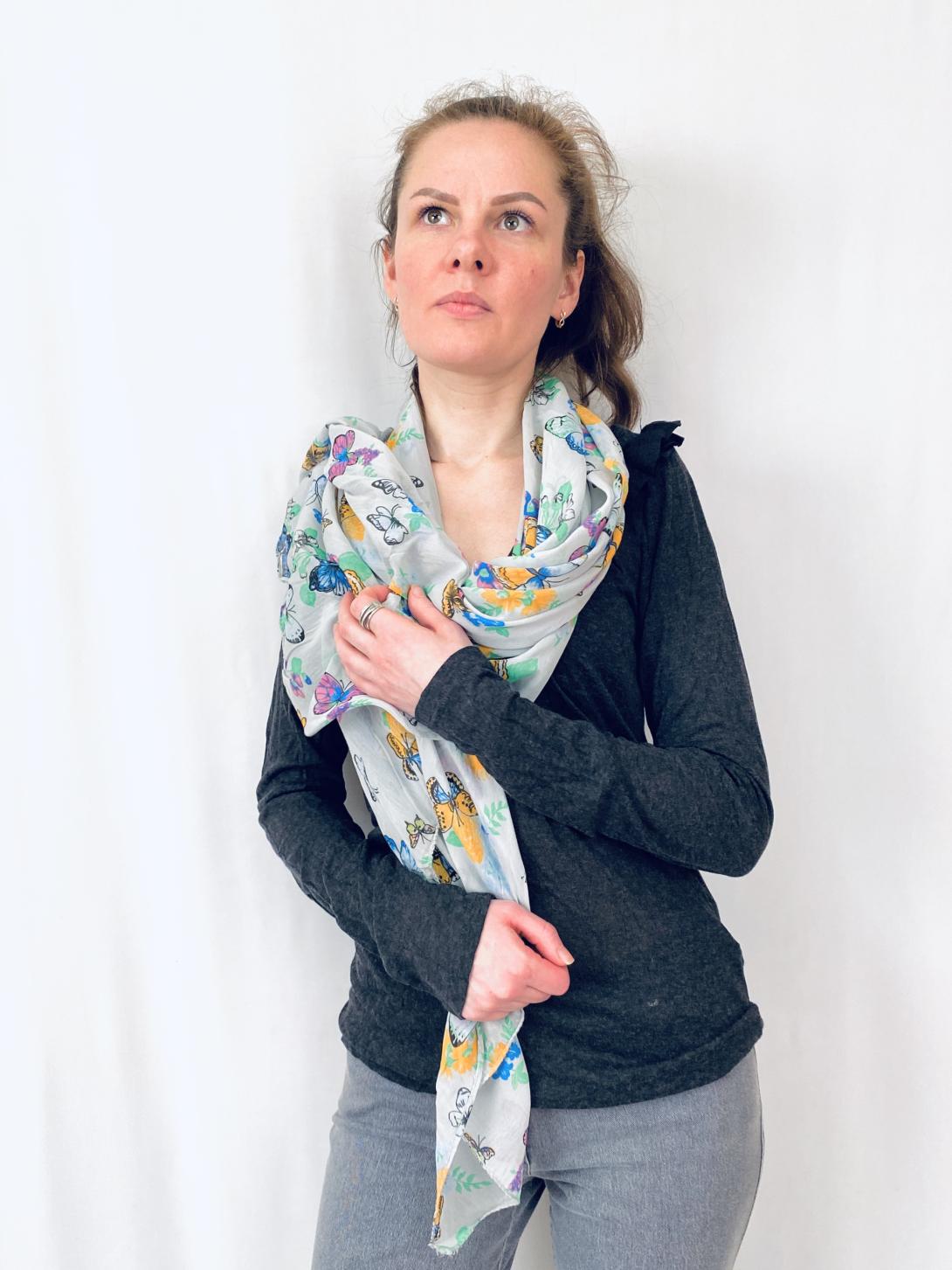 Шарф асимметричный в позитивной расцветке БАБОЧКИ- символ лёгкости жизни. Шарф мультиколор, его легко комплектовать с одеждой разного цвета. Шарф легко драпируется и не спадает с головы .