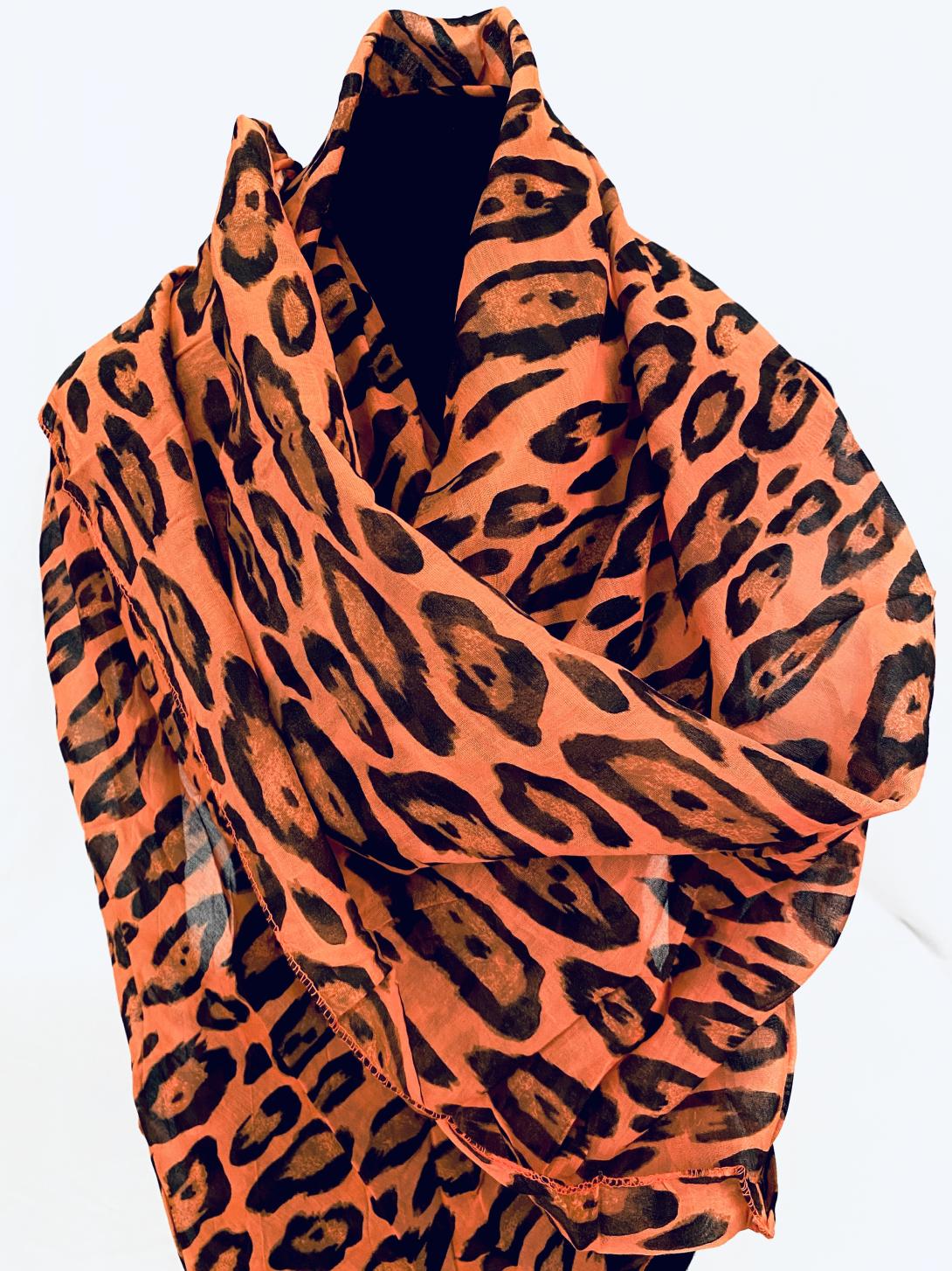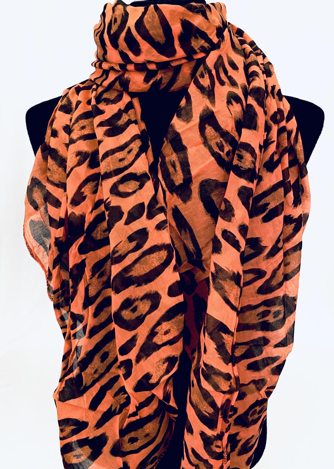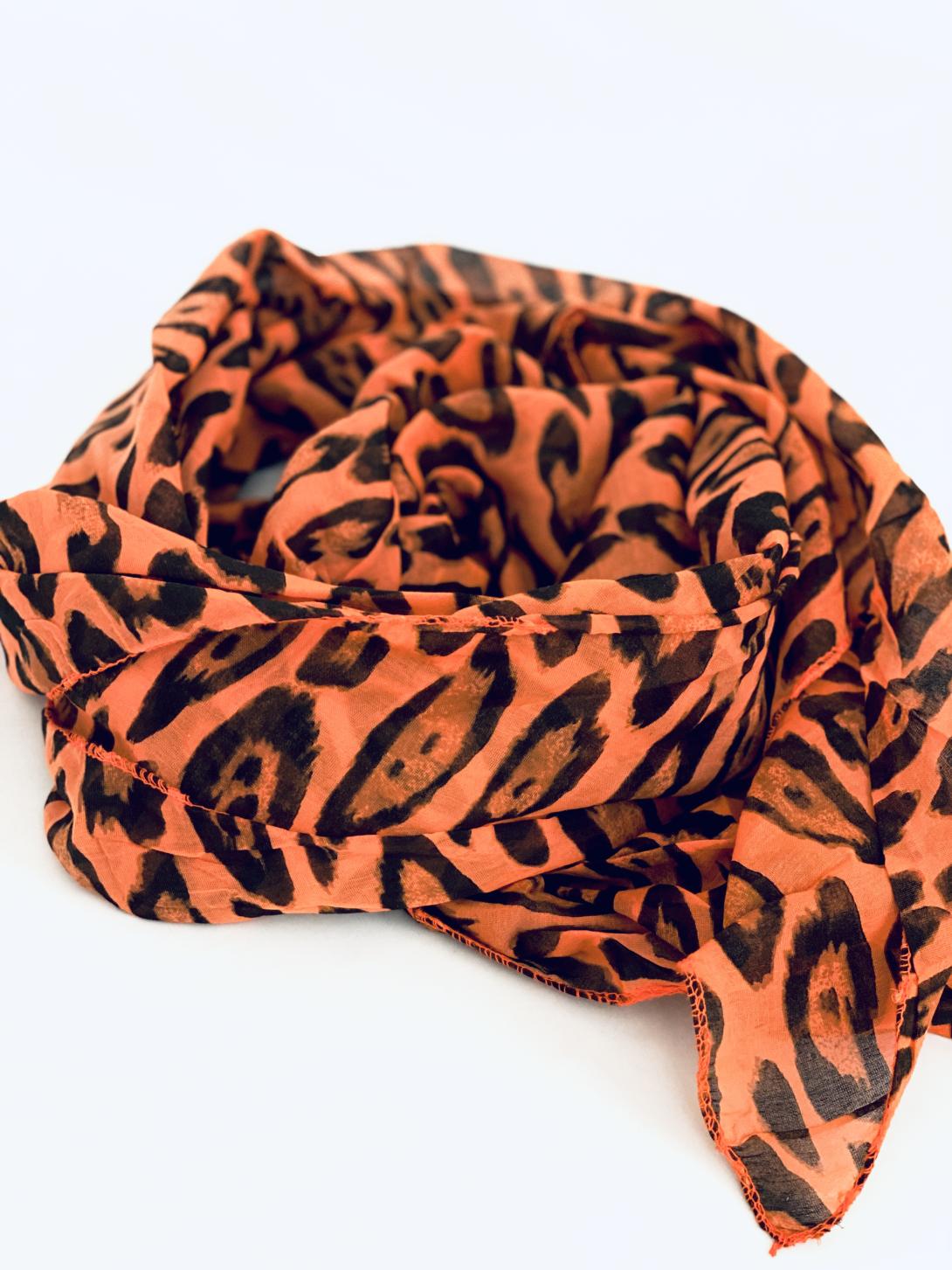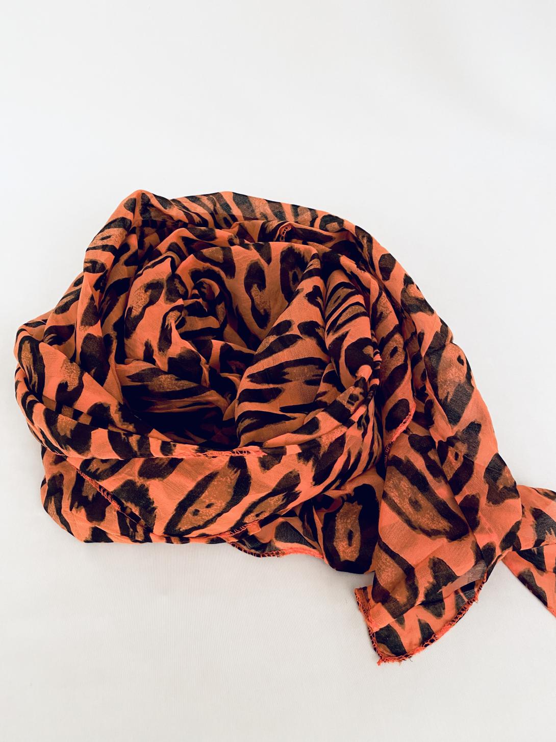 Ассиметричный эффектный ассиметричный шарф оранжевого цвета в принтом рептилий