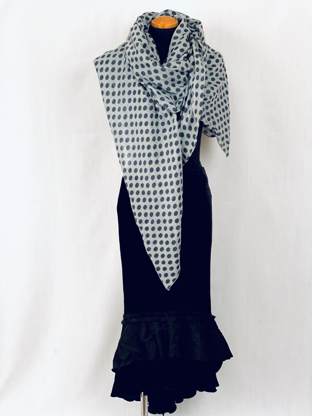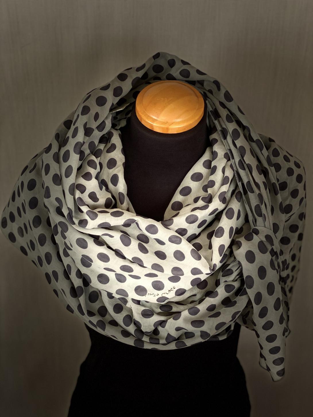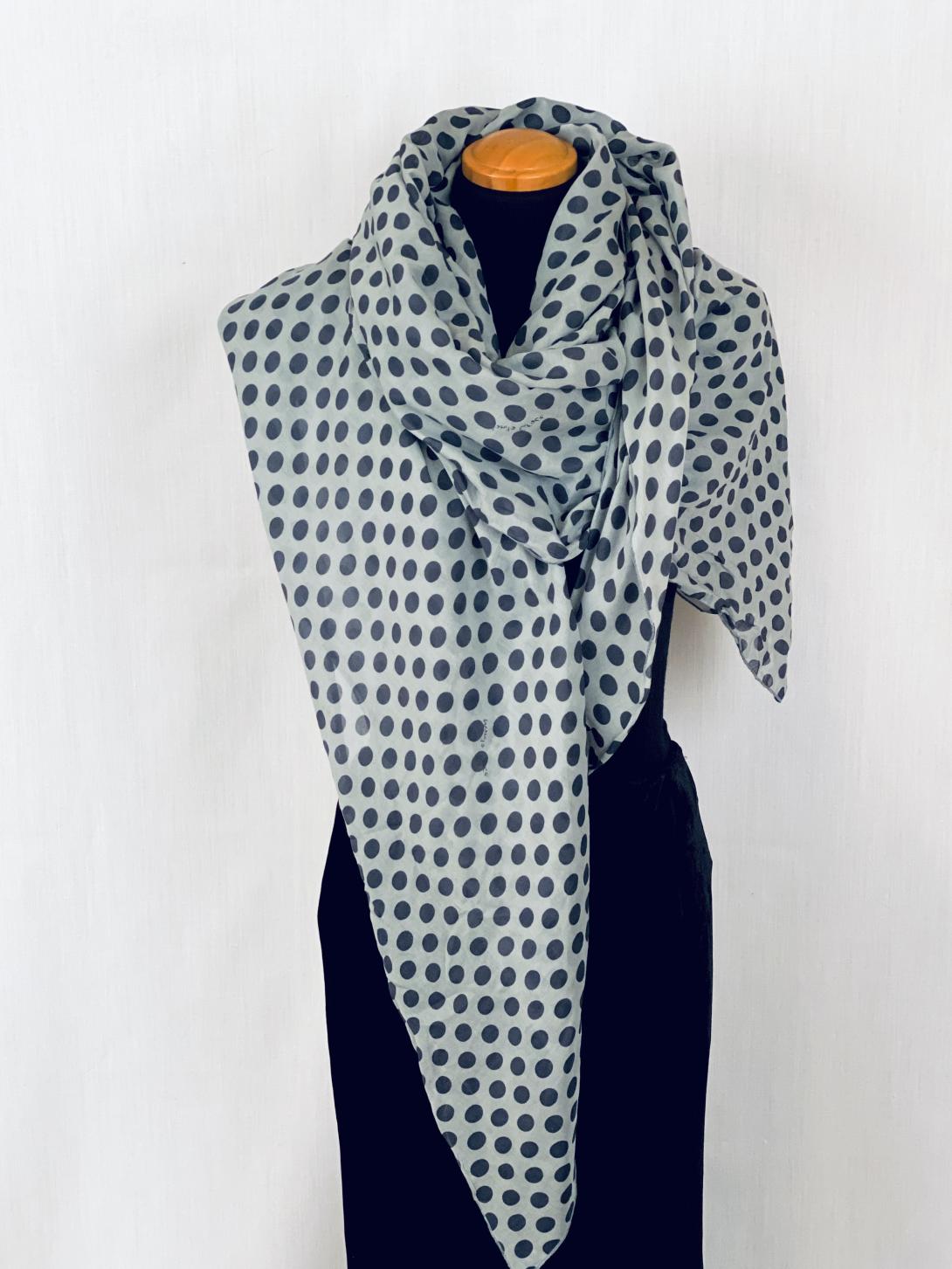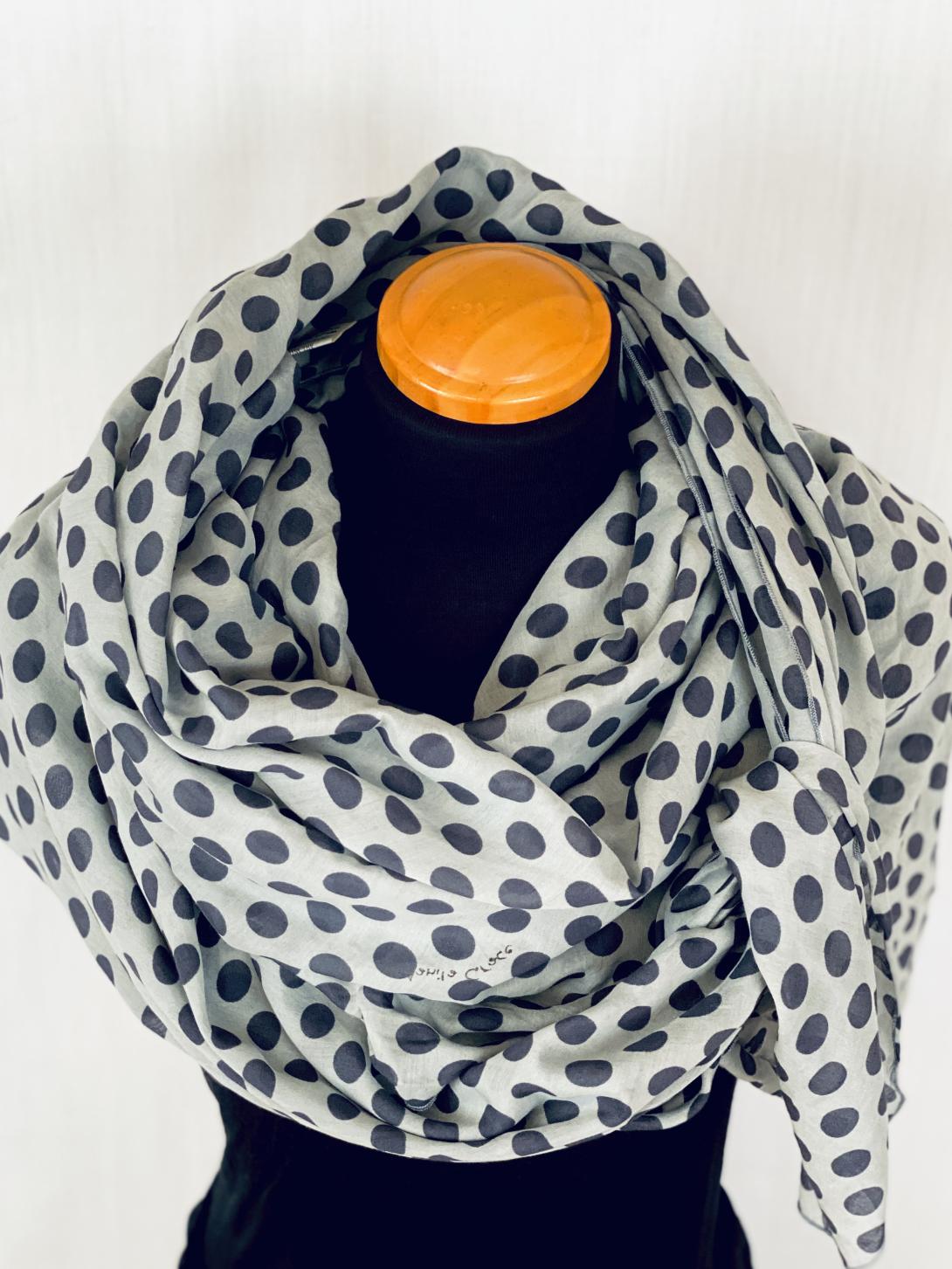 Его эксклюзивная цветовая гамма - серый и голубой - делает его идеальным подарком для женщин, которые ценят качество и стиль. Кроме того, принт в горошек добавляет шарм и элегантность вашему образу.