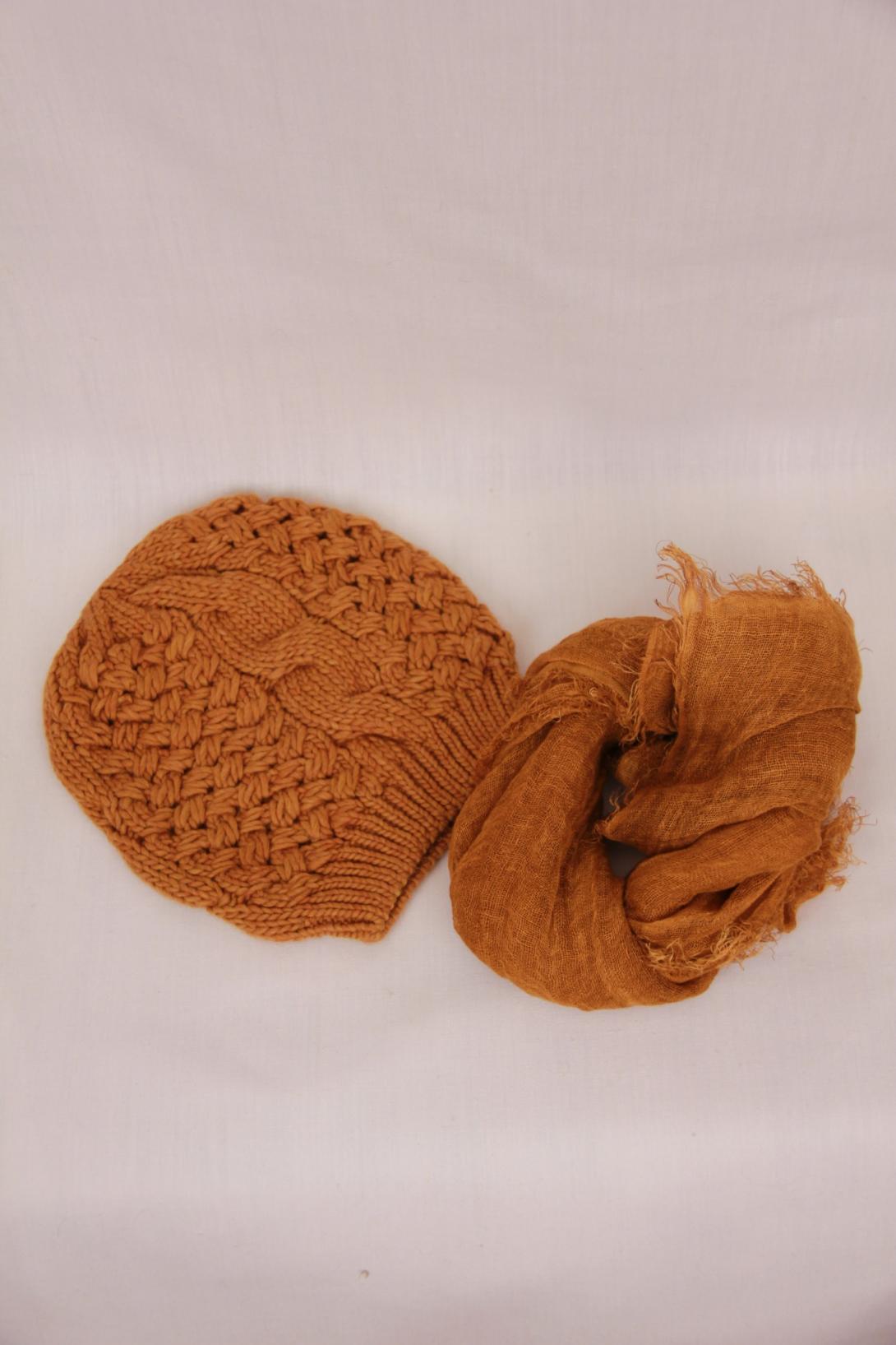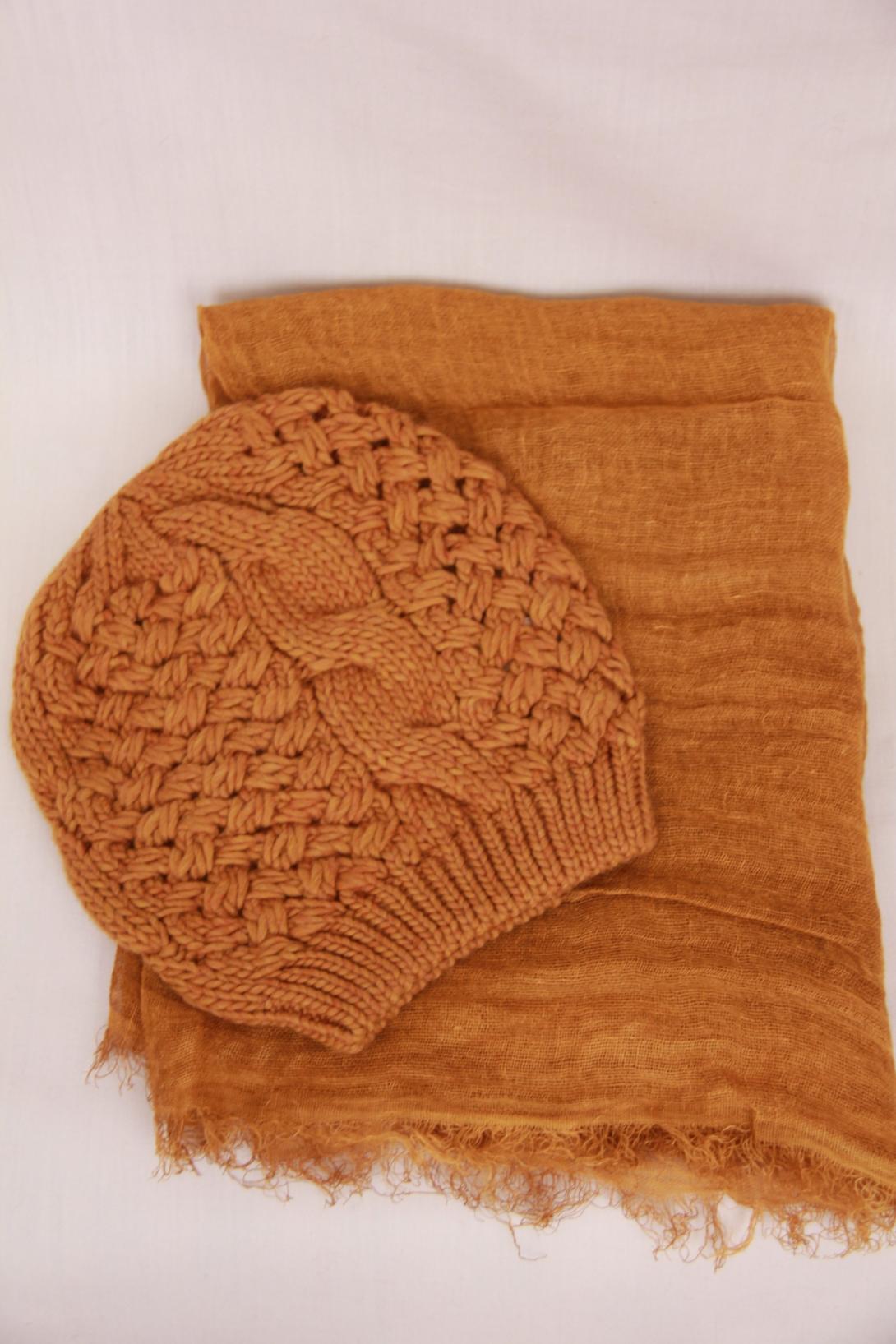 Отличная вязаная шапка модного цвета кари создаёт объём на голове. В комплек к зимней шапке можно купить большой шарф аналогичного цвета.