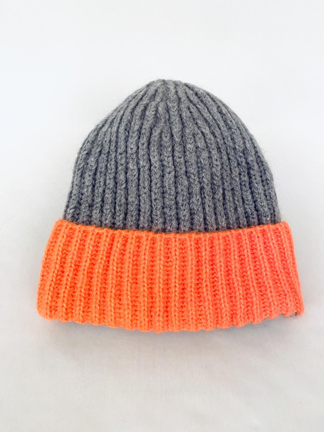 Шапка представлена в ярком оранжевом цвете с серым отворотом. Такой дизайн подчеркнет вашу индивидуальность и добавит яркости в зимний гардероб.