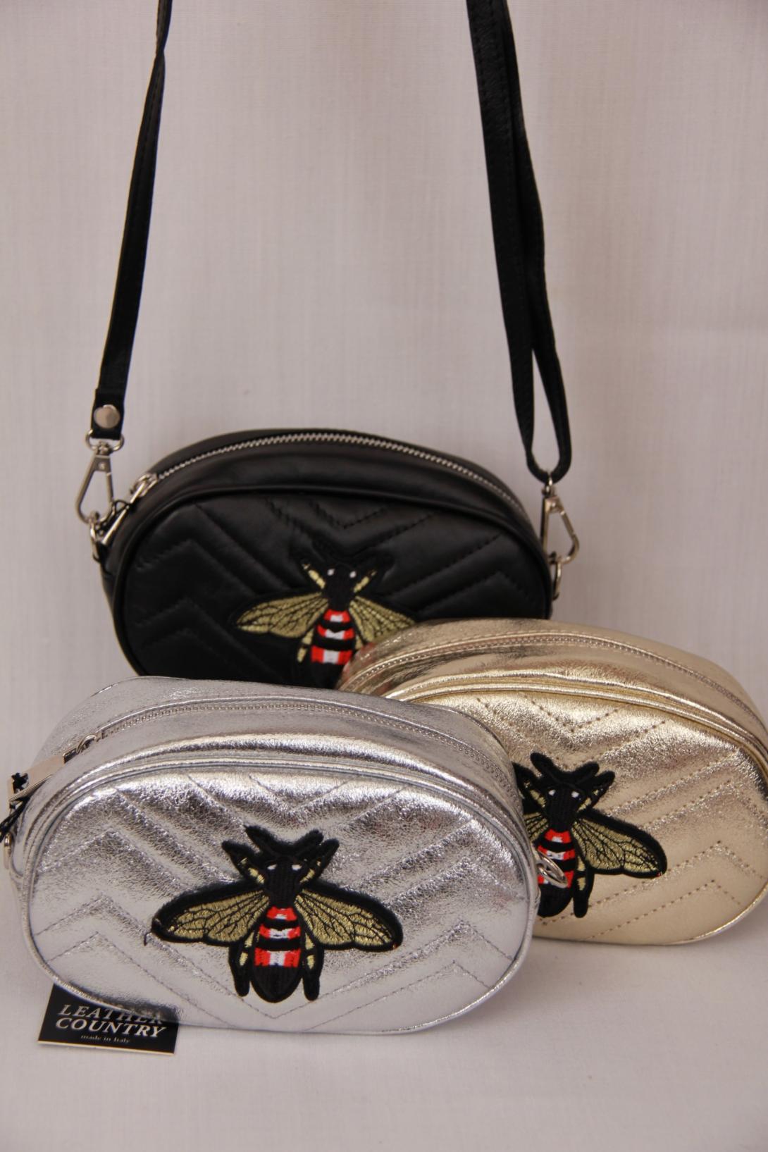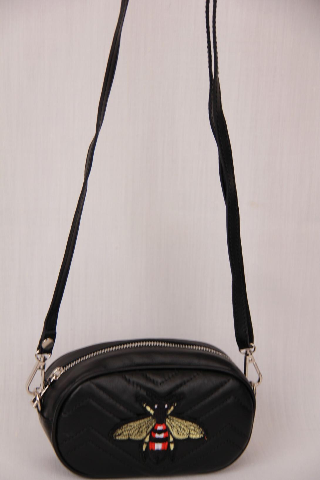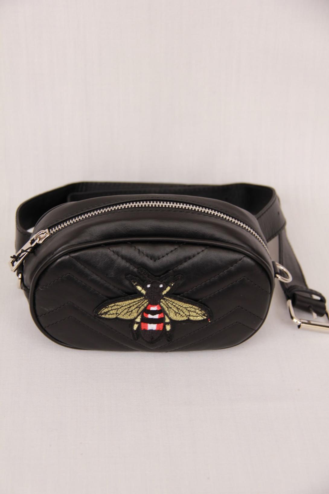 Обратите внимание на очень модную в этом сезоне напоясную сумку с пчёлкой из гладкой кожи с одним отделением.Эту модель сумки можно носить на талии. а также и как обычную маленькую сумочку.так как в комплекте есть дополнительный тонкий длинный ремень.