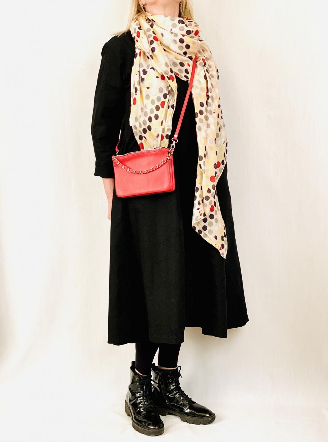 Красная элегантная сумка. Сумку можно носить через плечo или в руке. Сумка имеет два отдела замке "молния" и скрытый карман.