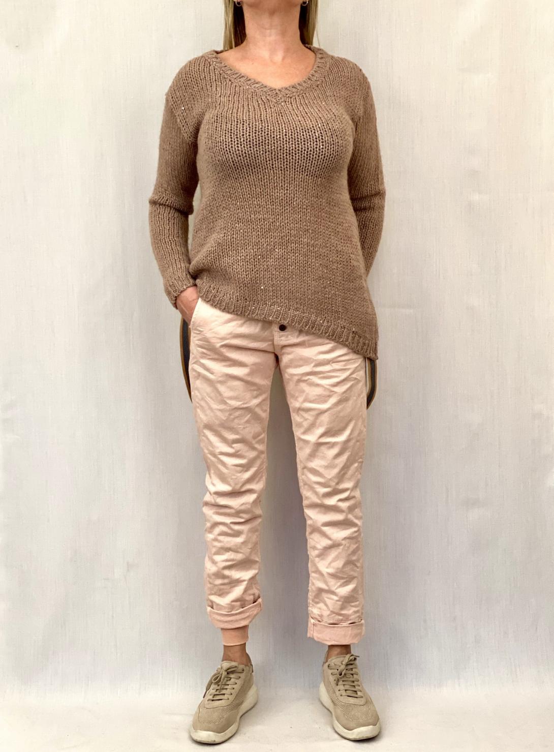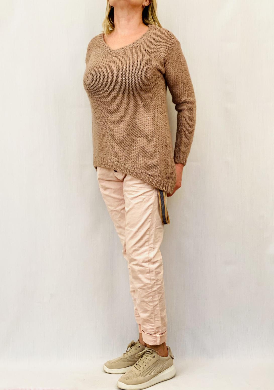 Джемпер с V-образным вырезом и ассиметричным подолом. Эту вещь можно отнести в разряд нарядных вещей, так как блёски , сразу относят этот свитер к стилю СПОРТШИК.