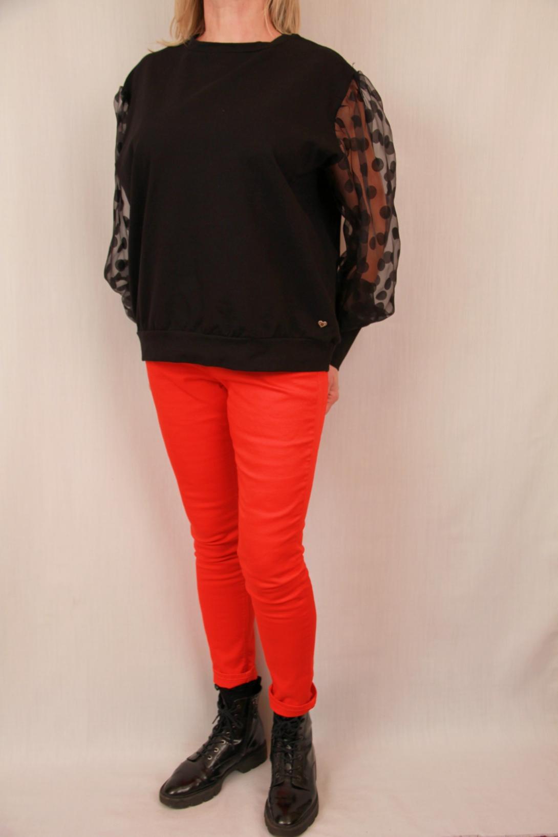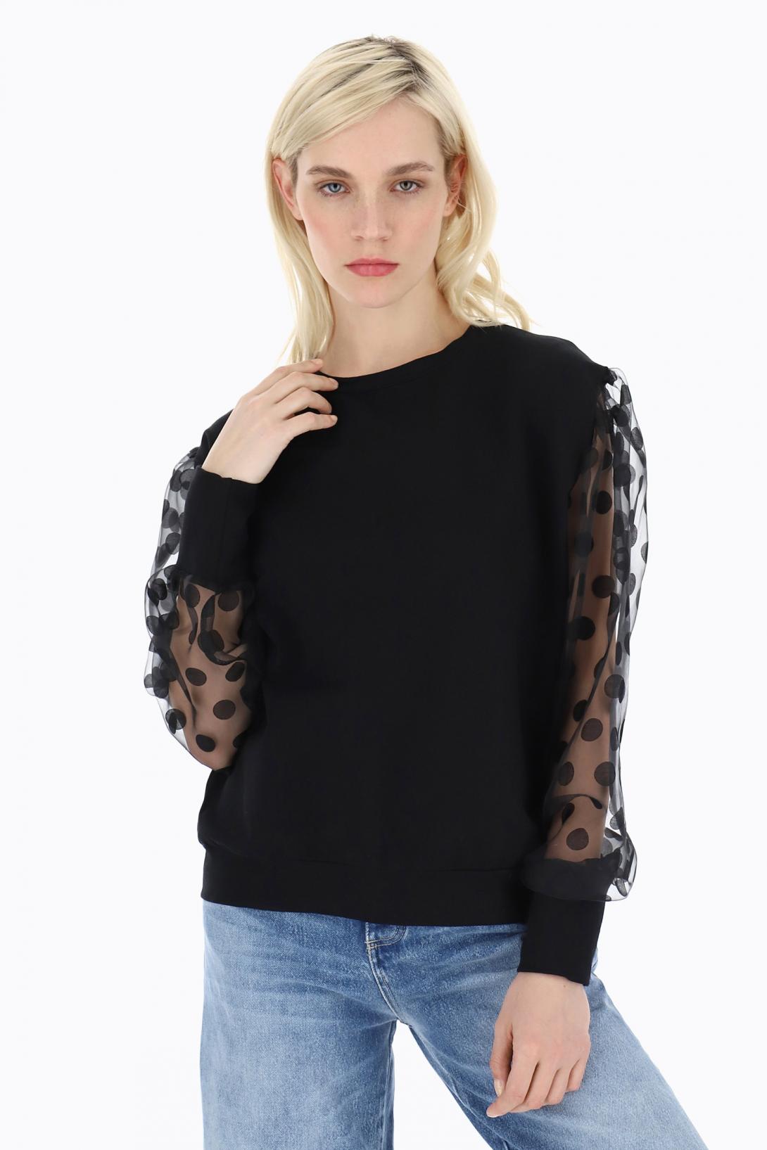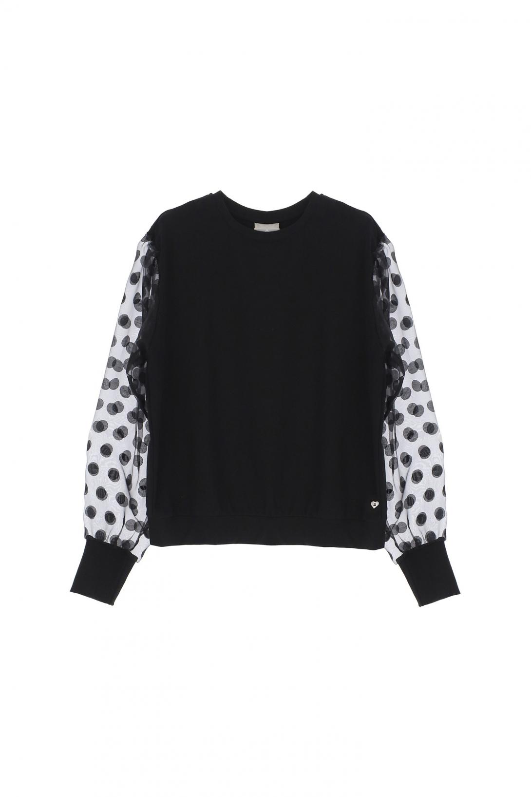 Рукав из органзы в горох делает привычный свитшот женственным и изыскано красивым.