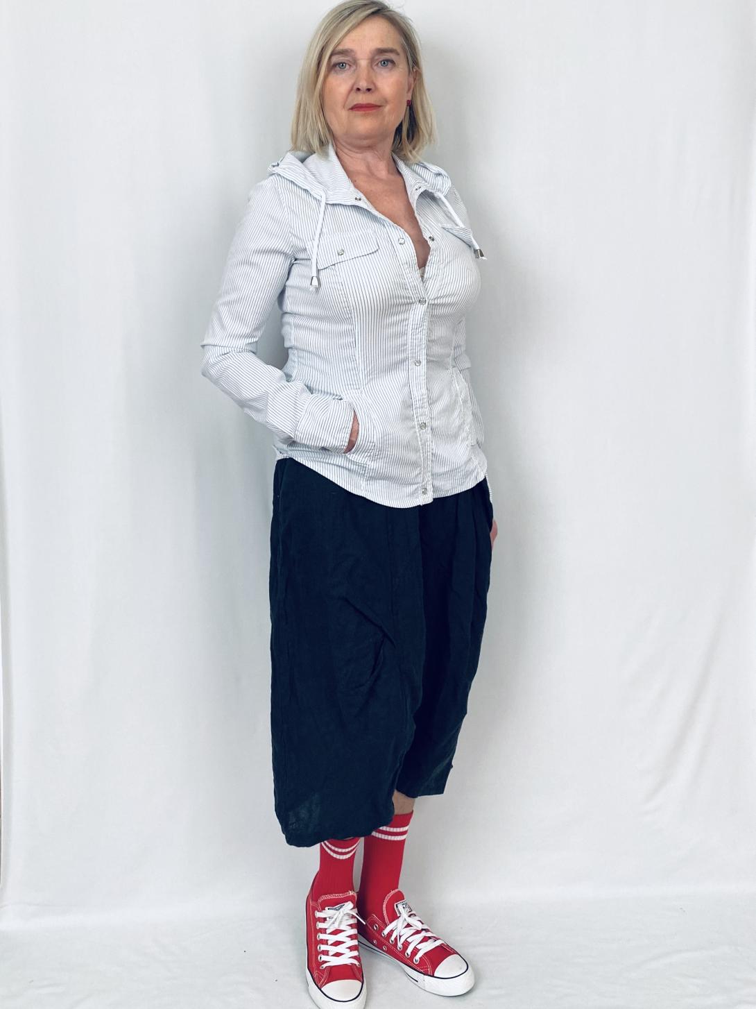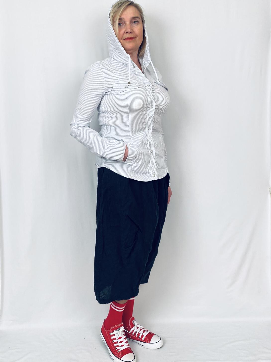 Свитшот из тонкого хлопка, в тонкую голубую полоску. Модель приталенная ,застёжка на кнопках.С капюшоном, есть карманы. Свитшот Please - это идеальный выбор для летнего сезона. Изготовленный из высококачественных материалов, он обеспечит комфорт и стиль в течение всего дня. Размерная сетка включает размеры 42-46, что позволяет выбрать подходящий вариант для любого телосложения. Цвет белый, принт в виде полоски придает свитшоту элегантности и стиля.