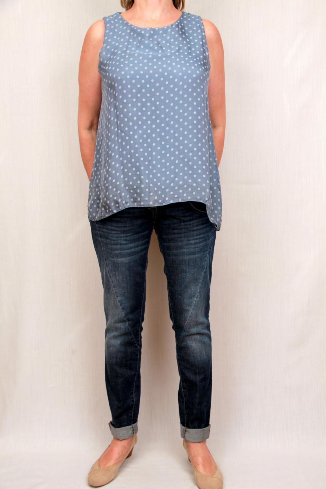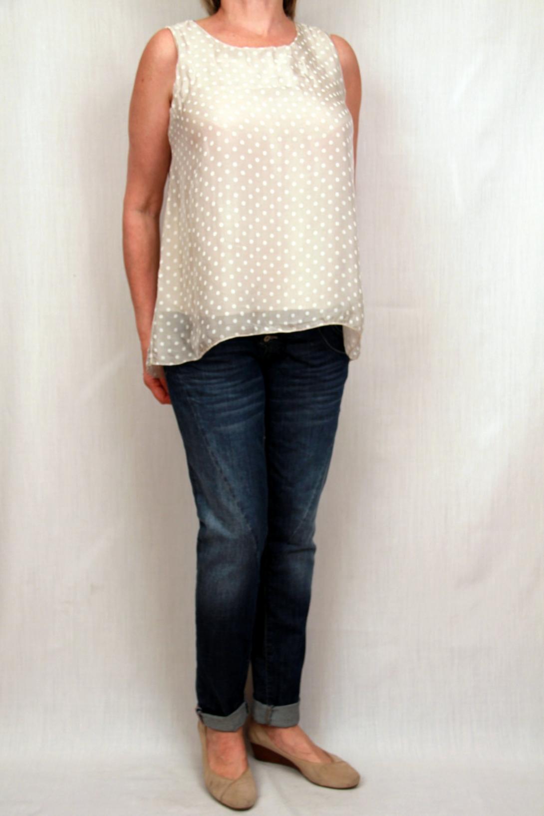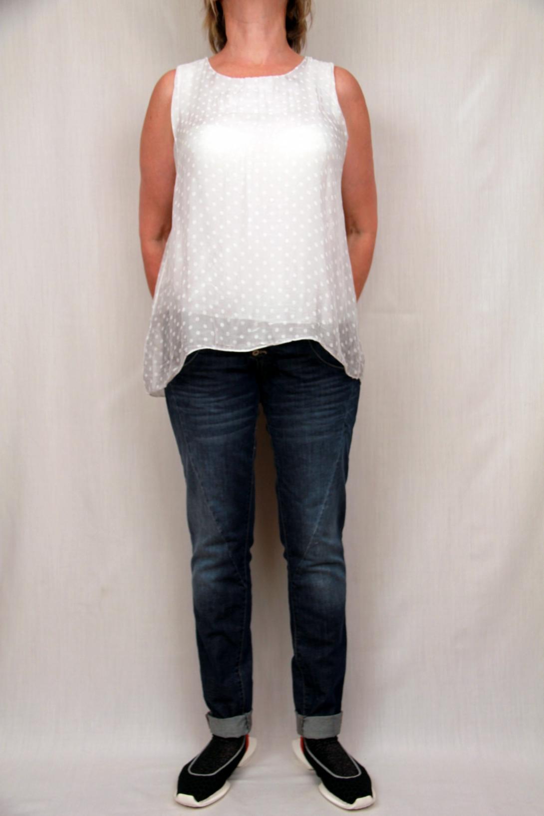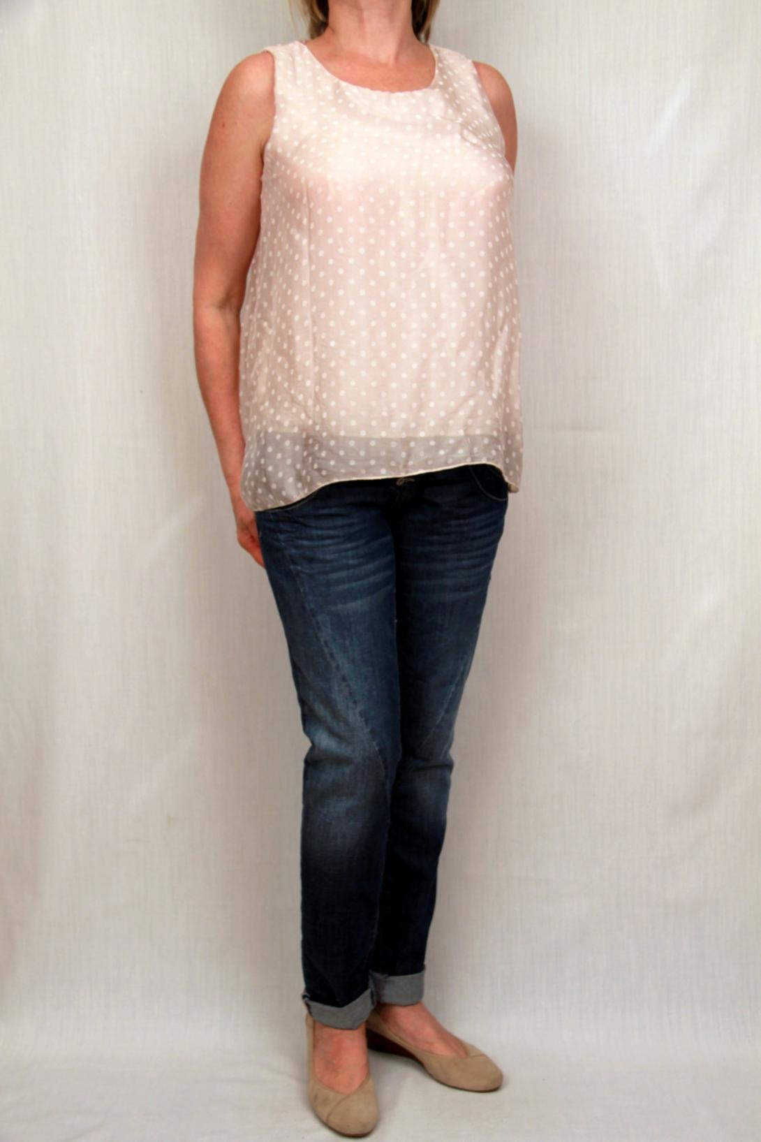 Красивый шёлковый топ, маячного кроя в еле-заметный горох. Только в белом цвете.