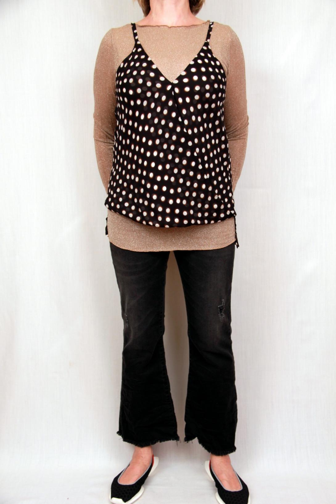Стильный топ в горох свободного кроя от итальянского бренда King-Kong. В этом сезоне очень важно уметь комплектовать одежду..Вы видите на фотографии какой удачный комплект одежды получается с трикотажной базой с добавлением люрекса в цвете nudo.