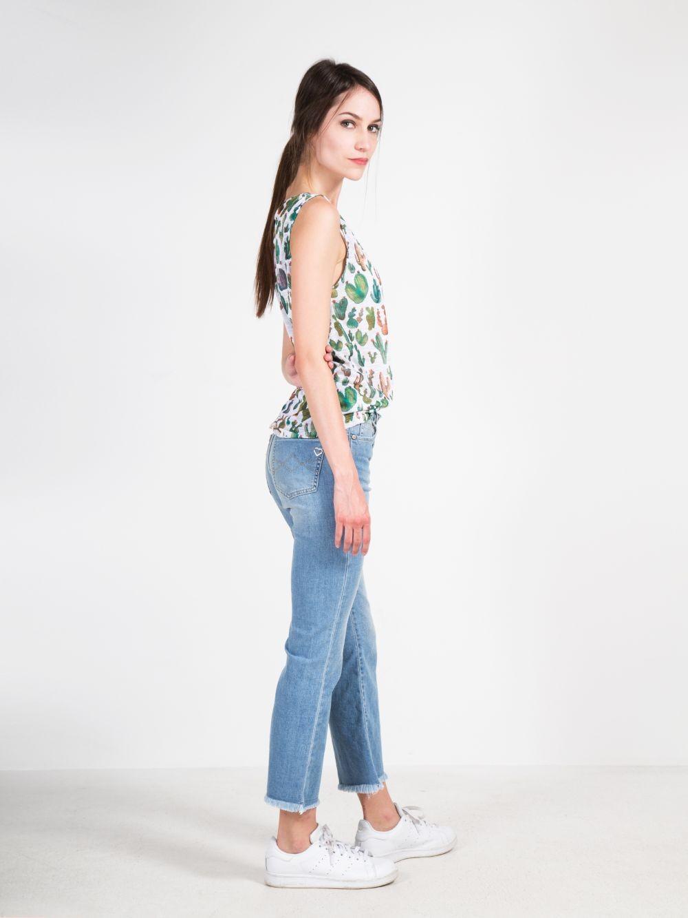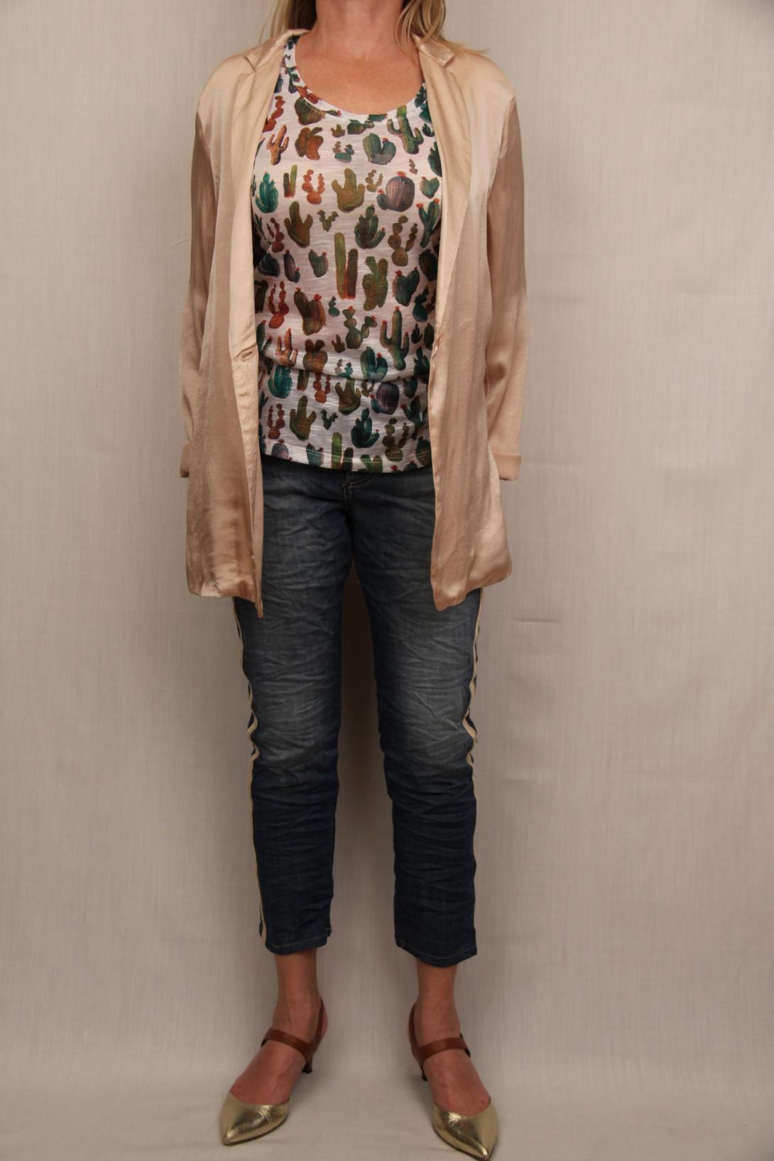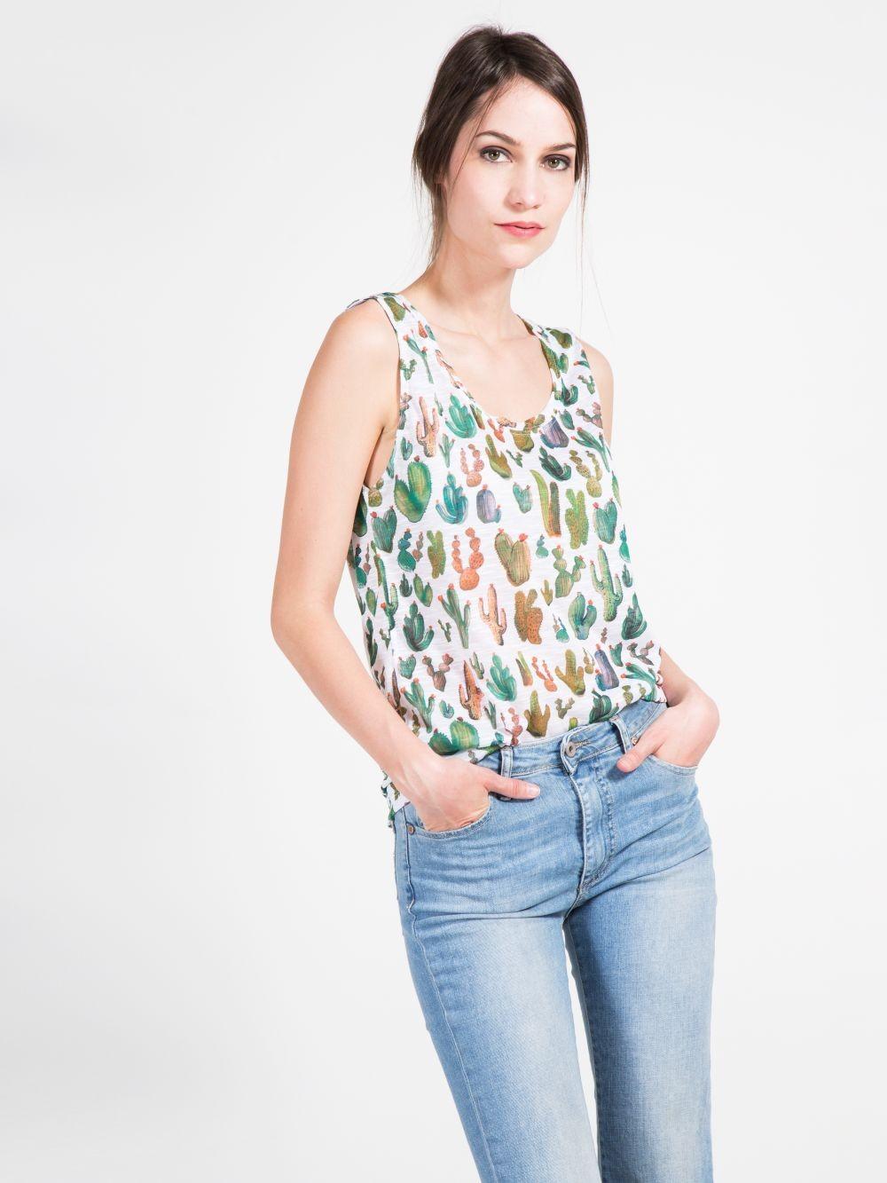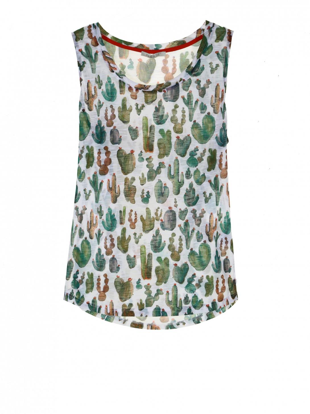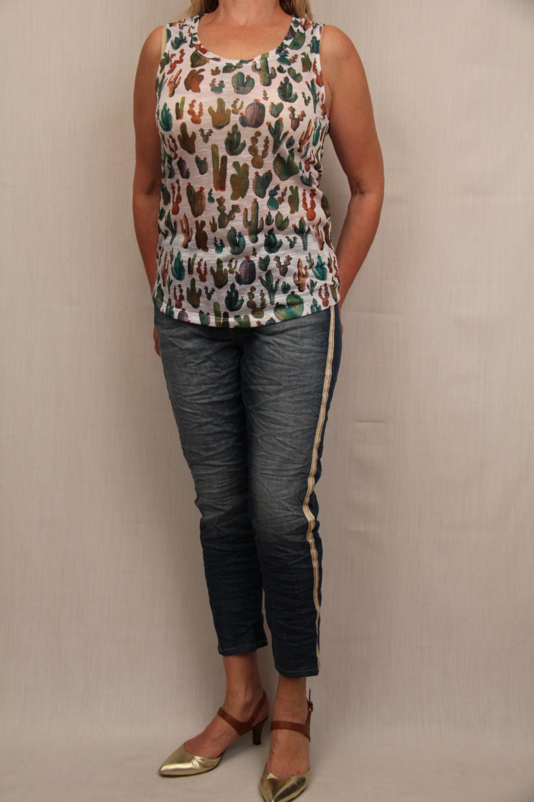 Весёленький топ маячного типа с кактусами. Топ прекрасно комплектуется с нарядным атласным жакетом в пастельных тонах и джинсами с золотым лампасом.