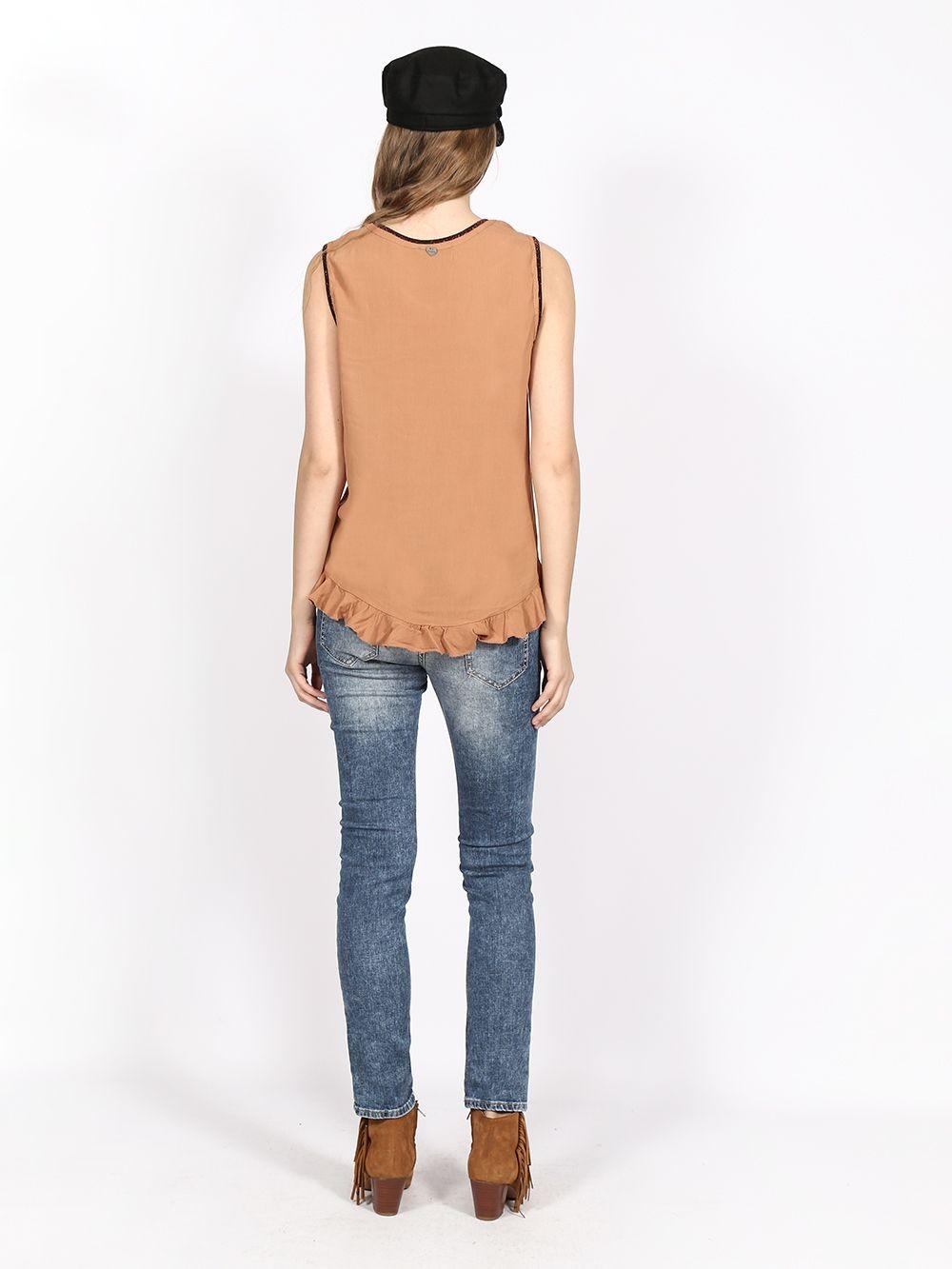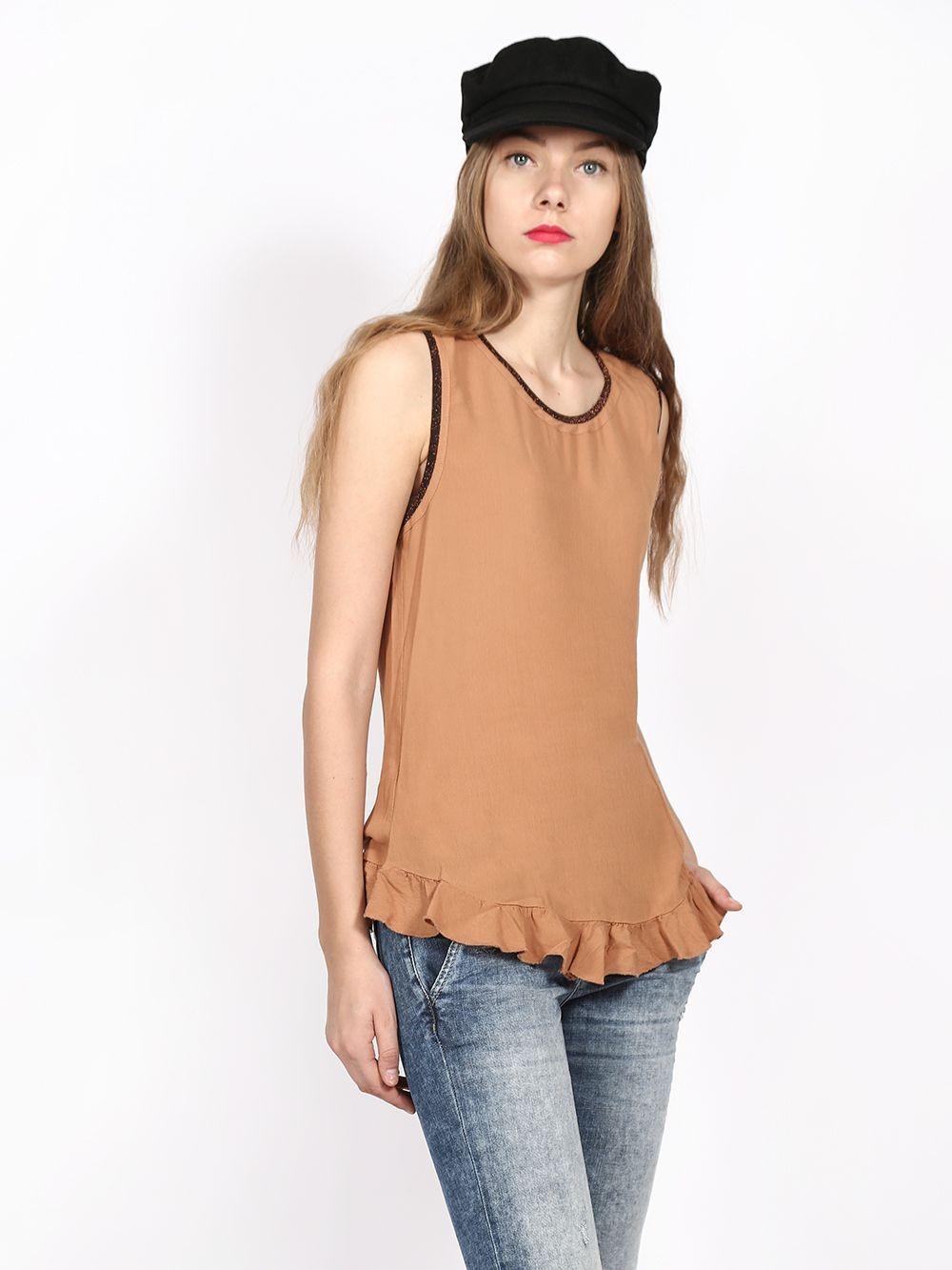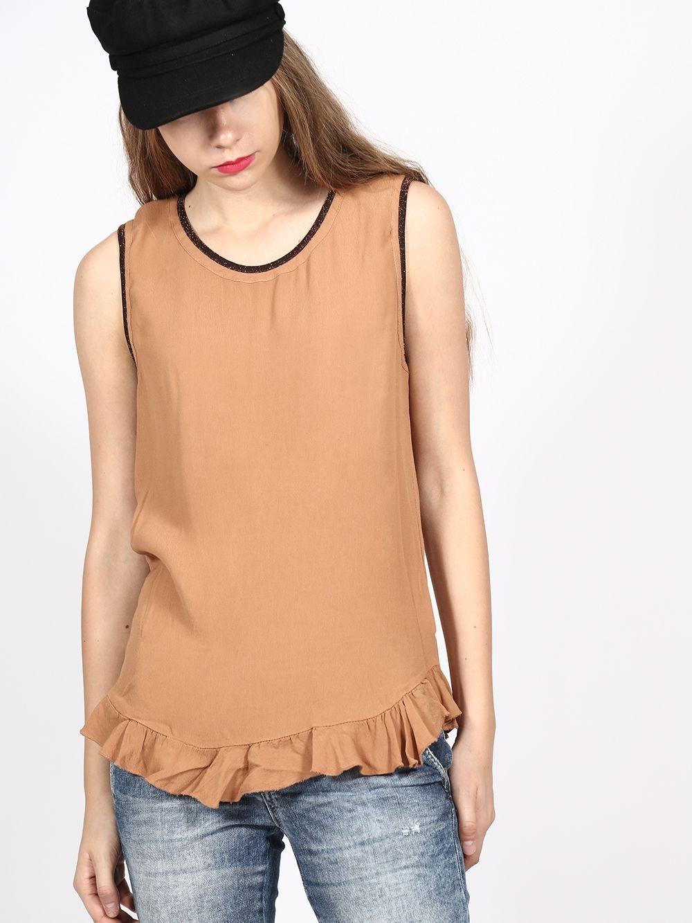 Топ необходимый элемент одежды, который одеваем под жакет или блузон с широким вырезом. Топ маячного плана с широкими бретельками и рюшкой по низу добавит женственности в креативный стиль.