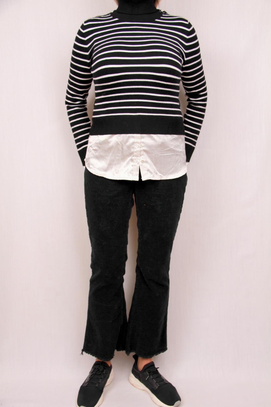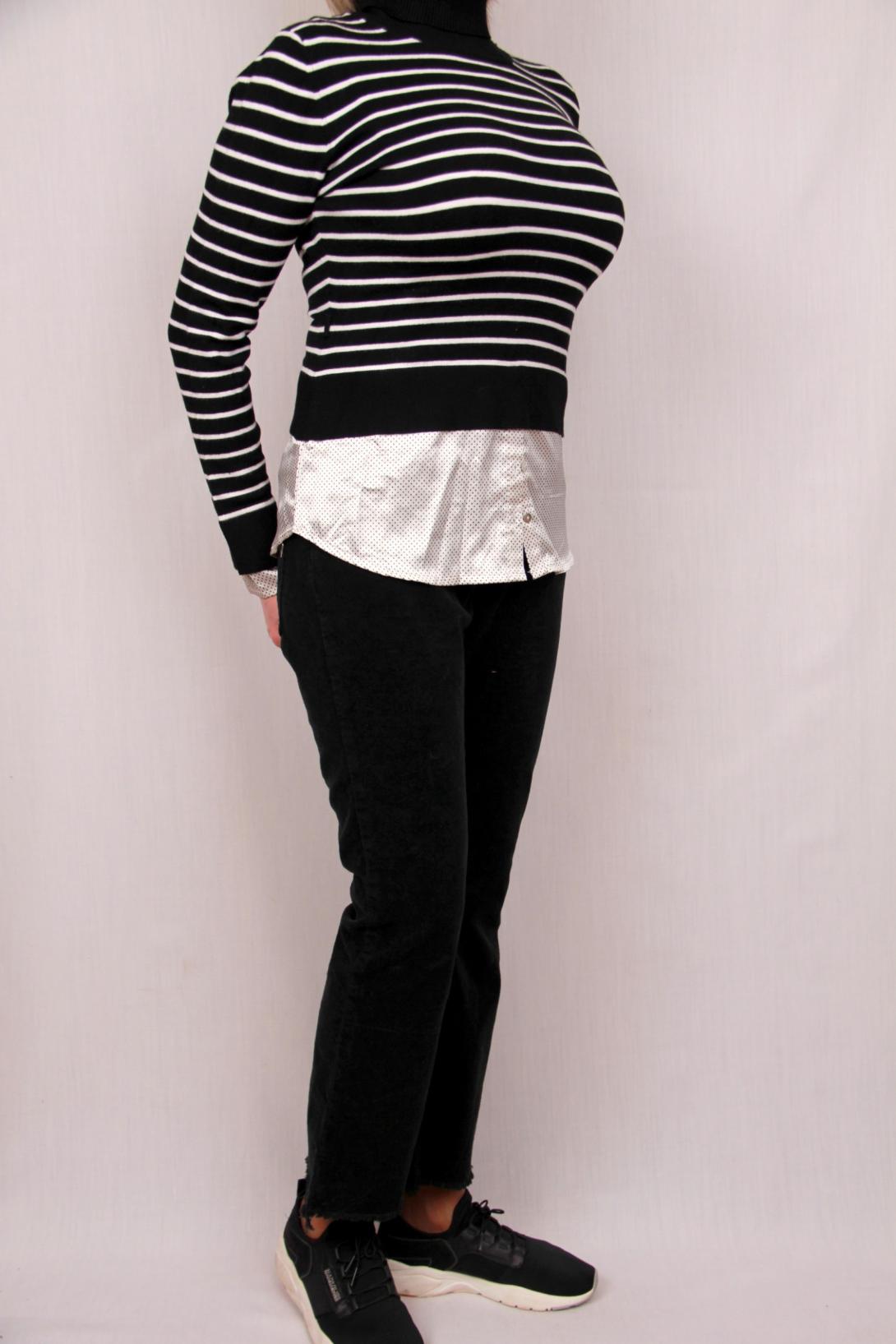 Очень качественный трикотаж эмитирующий две вещи в одной. На самом деле это достаточно плотная водолазка с эмитацией выглядывающей блузки. Рекомендуем для 44 размера одежды.