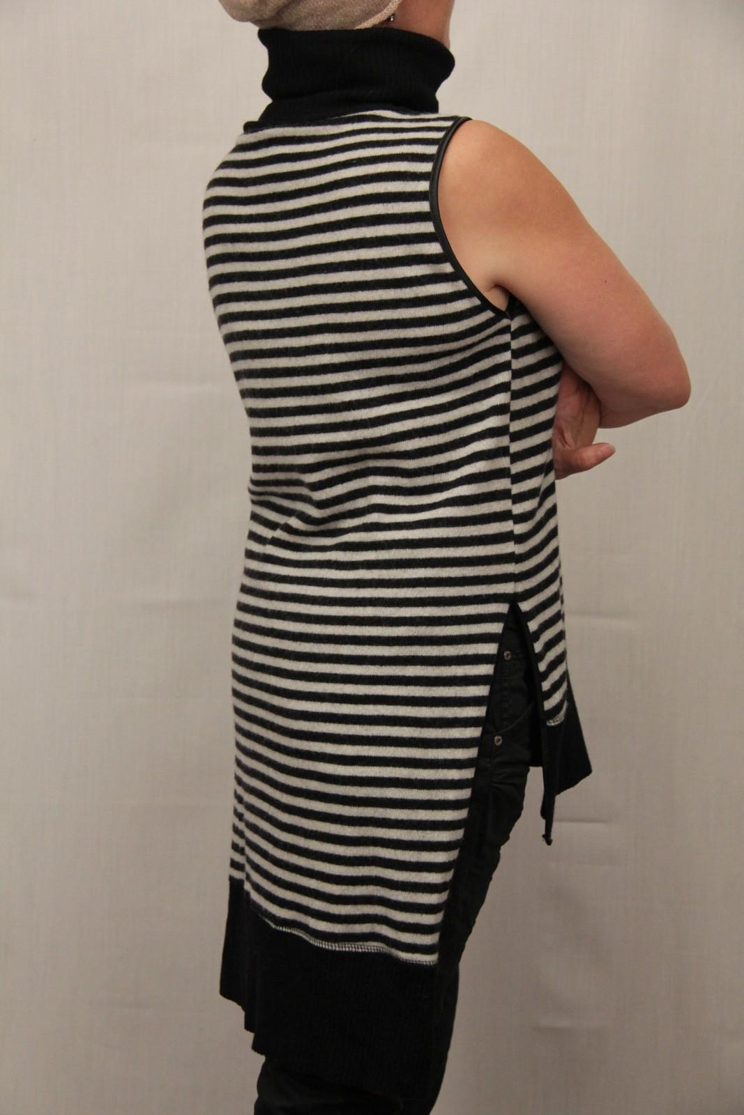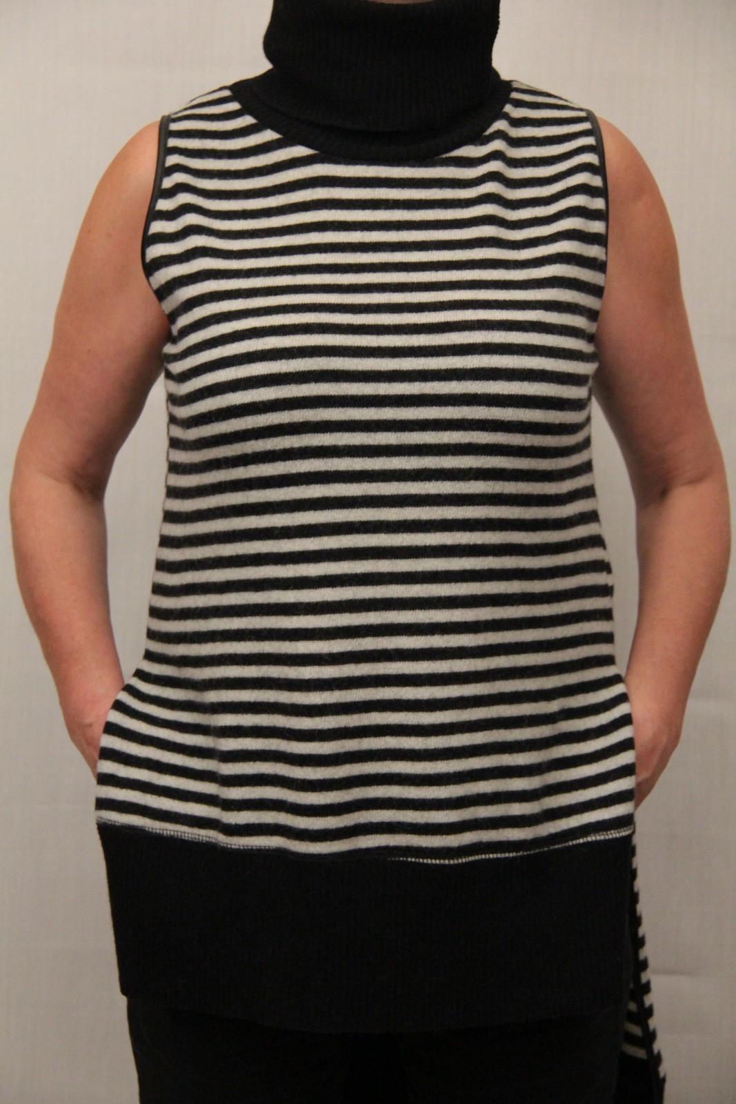 Очень стильная безрукавная полосатая водолазка с разнополой длинной.Одежда такого плана универсальна и легко комплектуется с футболкой, базовой моделью или с блузкой.
