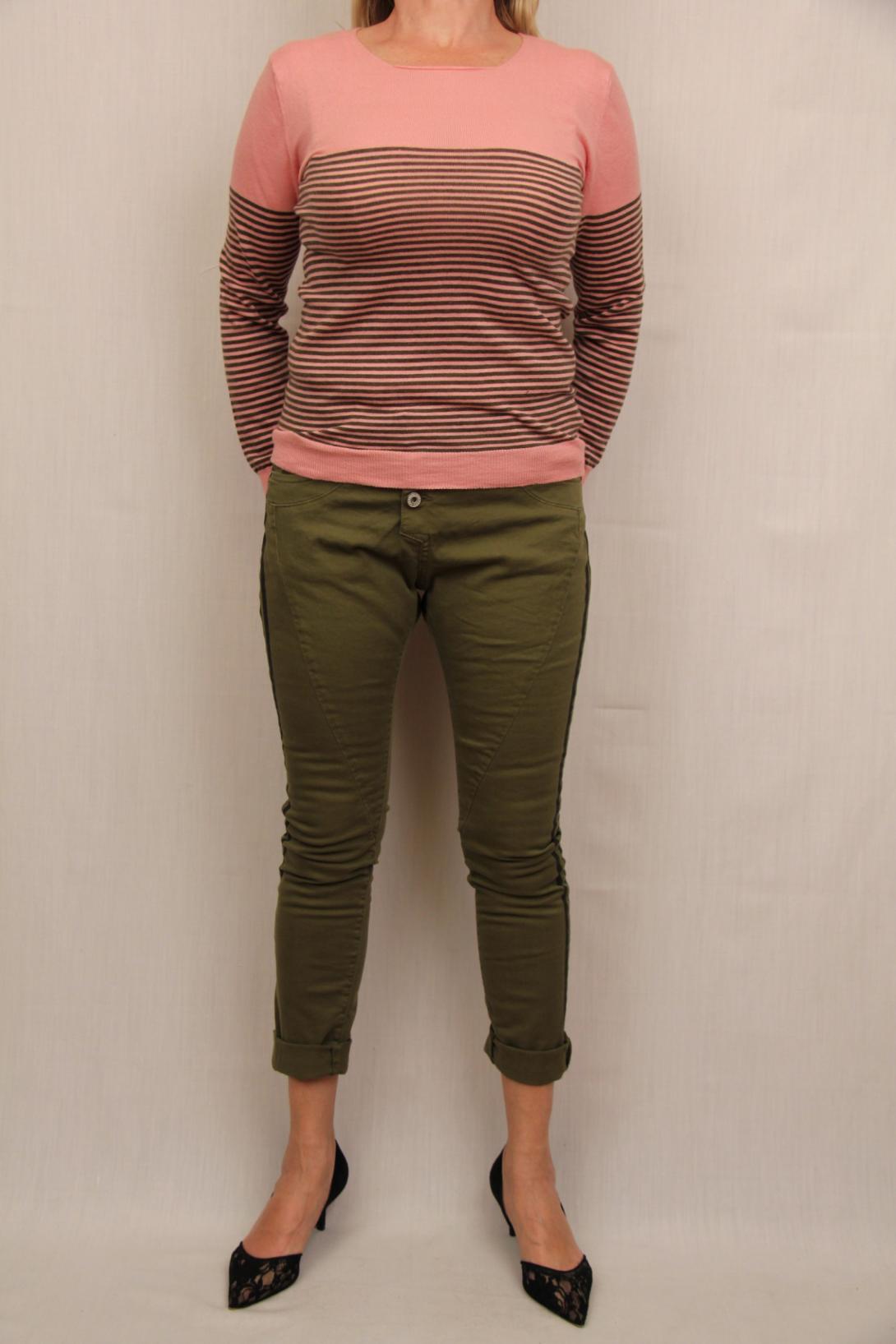 Очень красивое сочетание розового и цвета хаки.Итальянский трикотаж прекрасно комплектуется с креативными джинсами с лампасами цвета хаки.