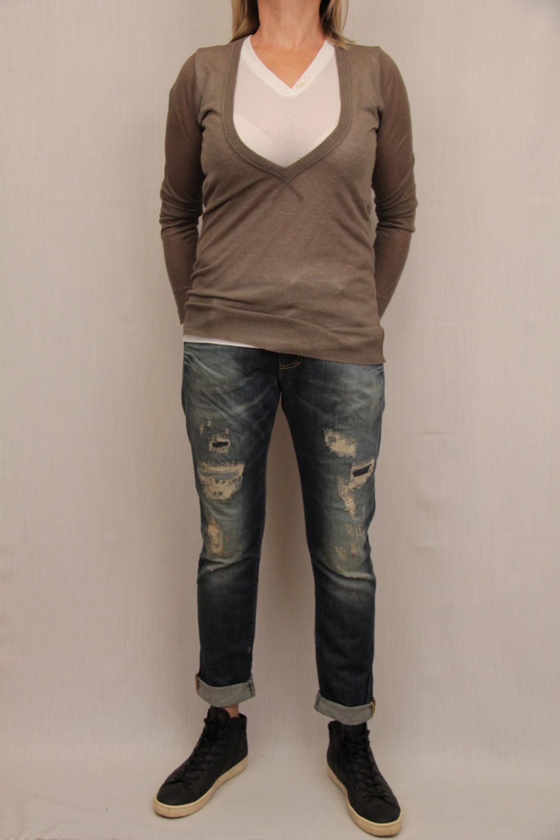 Трикотаж состоит сразу из двух вещей- белой майки и золотистого джемпера. Этот трикотажный джемпер прекрасно подойдёт для работы в офисе.
