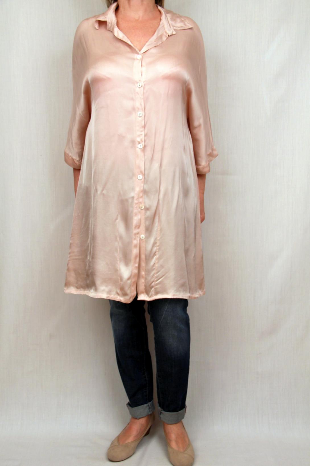 Атласная "рубашка" пудреного цвета в стиле кимоно может выполнять роль туники комплектуя её с джинсами или шортами. Можно использовать как самостоятельную вещь в вашем гардеробе.