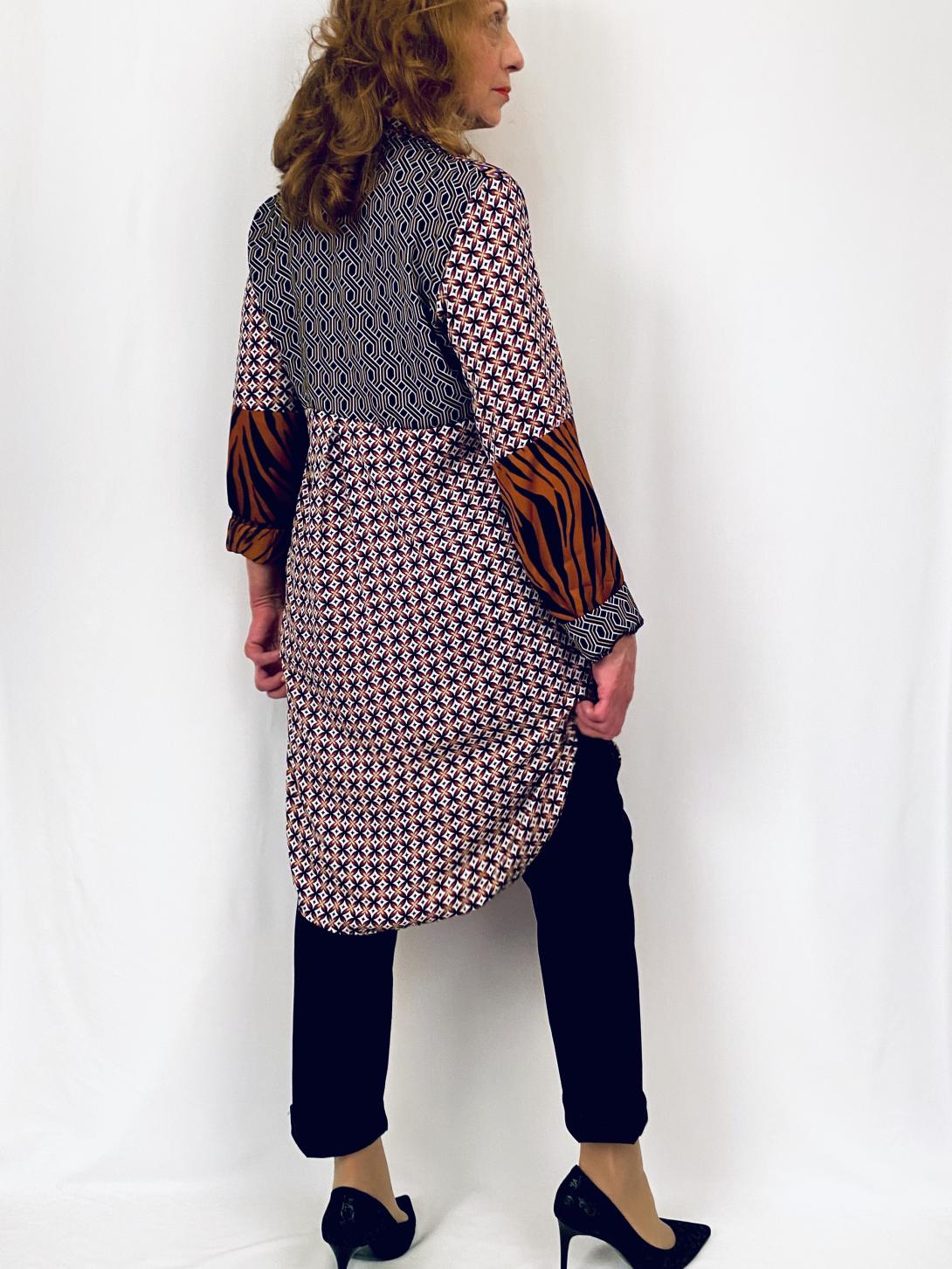 Туника представлена в коричневом цвете, который легко сочетается с различными цветами и аксессуарами.