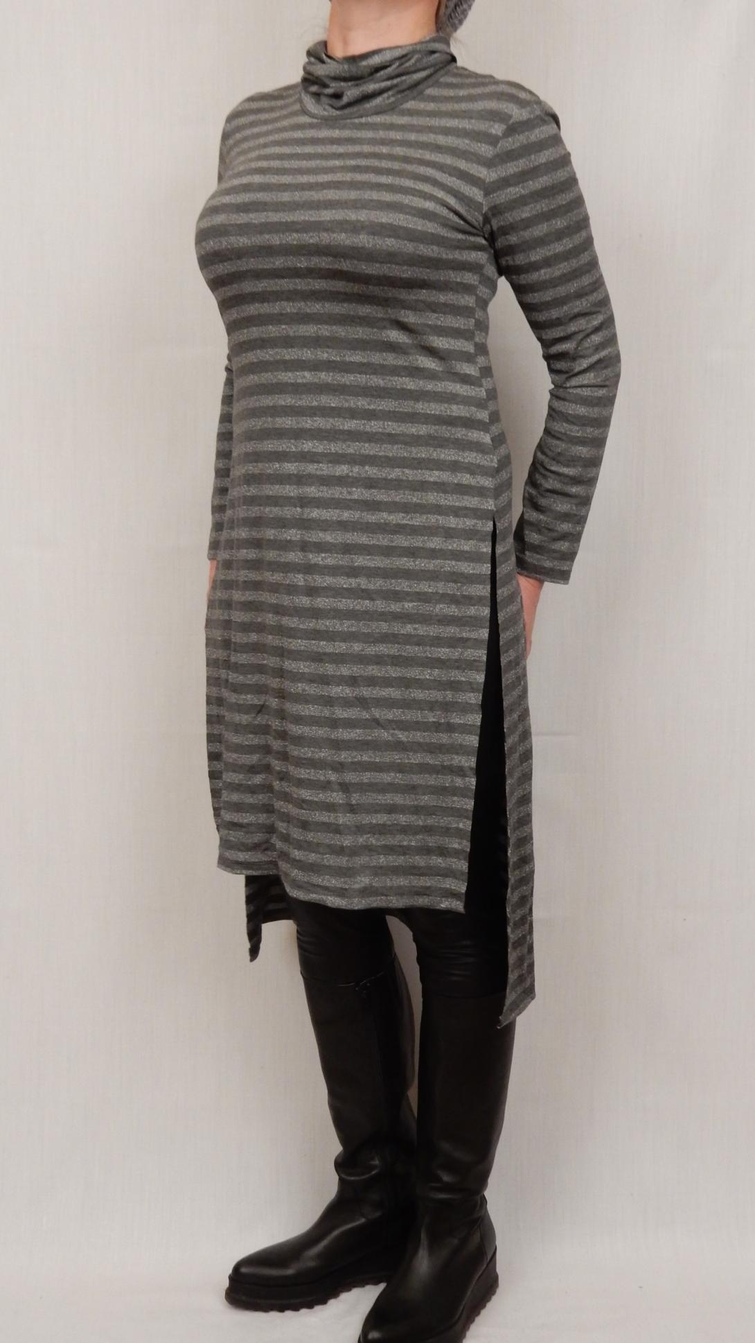 Нарядная туника бренд Please из тонкого но не прозрачного трикотажа со спокойной серебристой полоской люрекса который невероятно моден а этом сезоне. Высокие разрезы по бокам туники оптически делают ваши ноги растущими из ушей ;-)