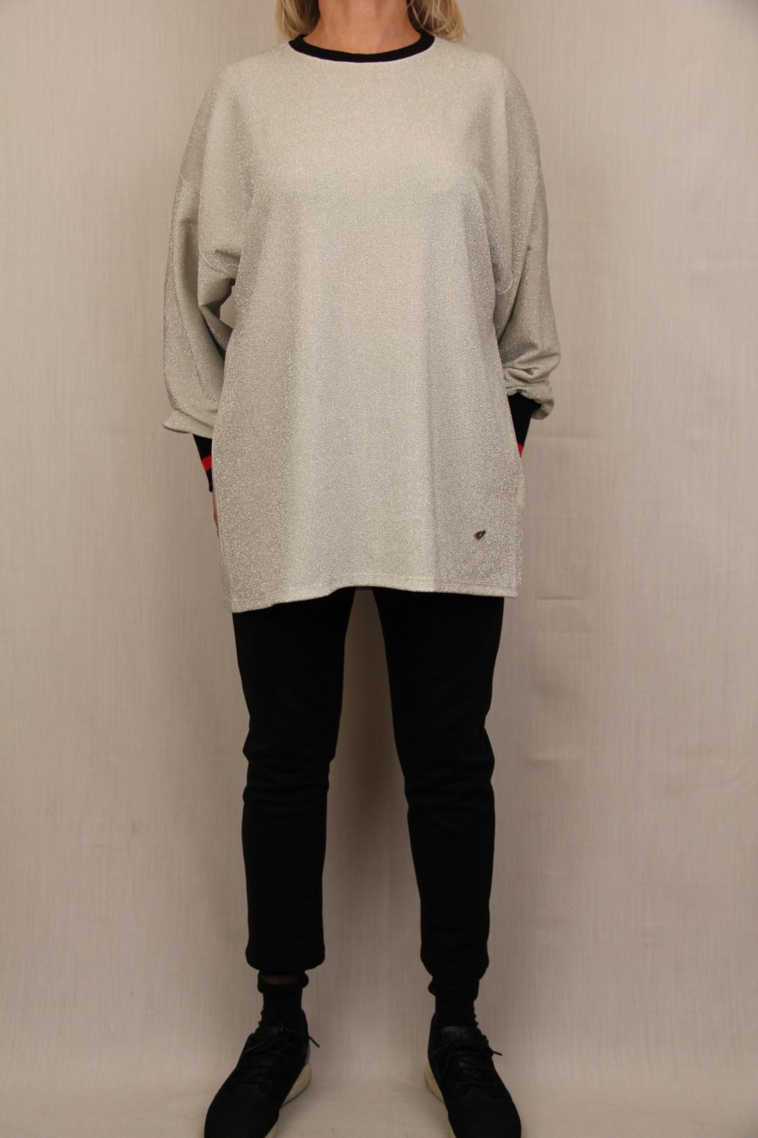 Блузон свободного силуэта можно фиксировать на талии мягким кожаным ремнём.Туника эффектная, с лёгким блеском и широкими контрастными чёрно-белыми манжетами.