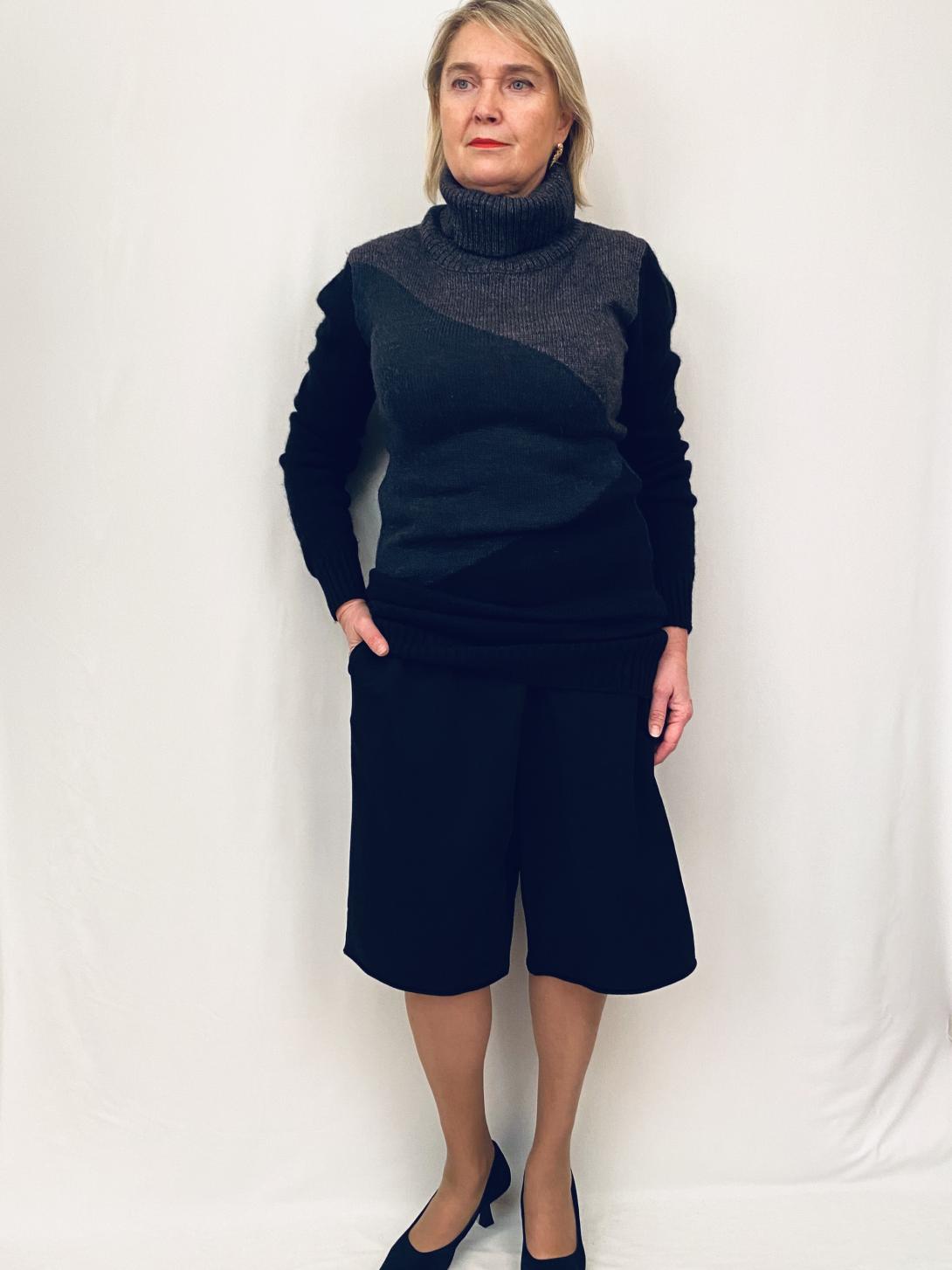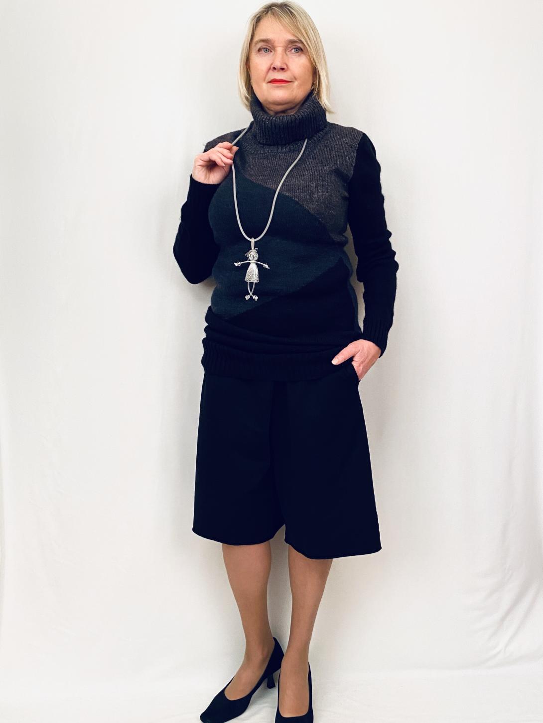 Цвет изделия - черный с тёмно синим ,что позволяет сочетать его с различными аксессуарами и обувью.
