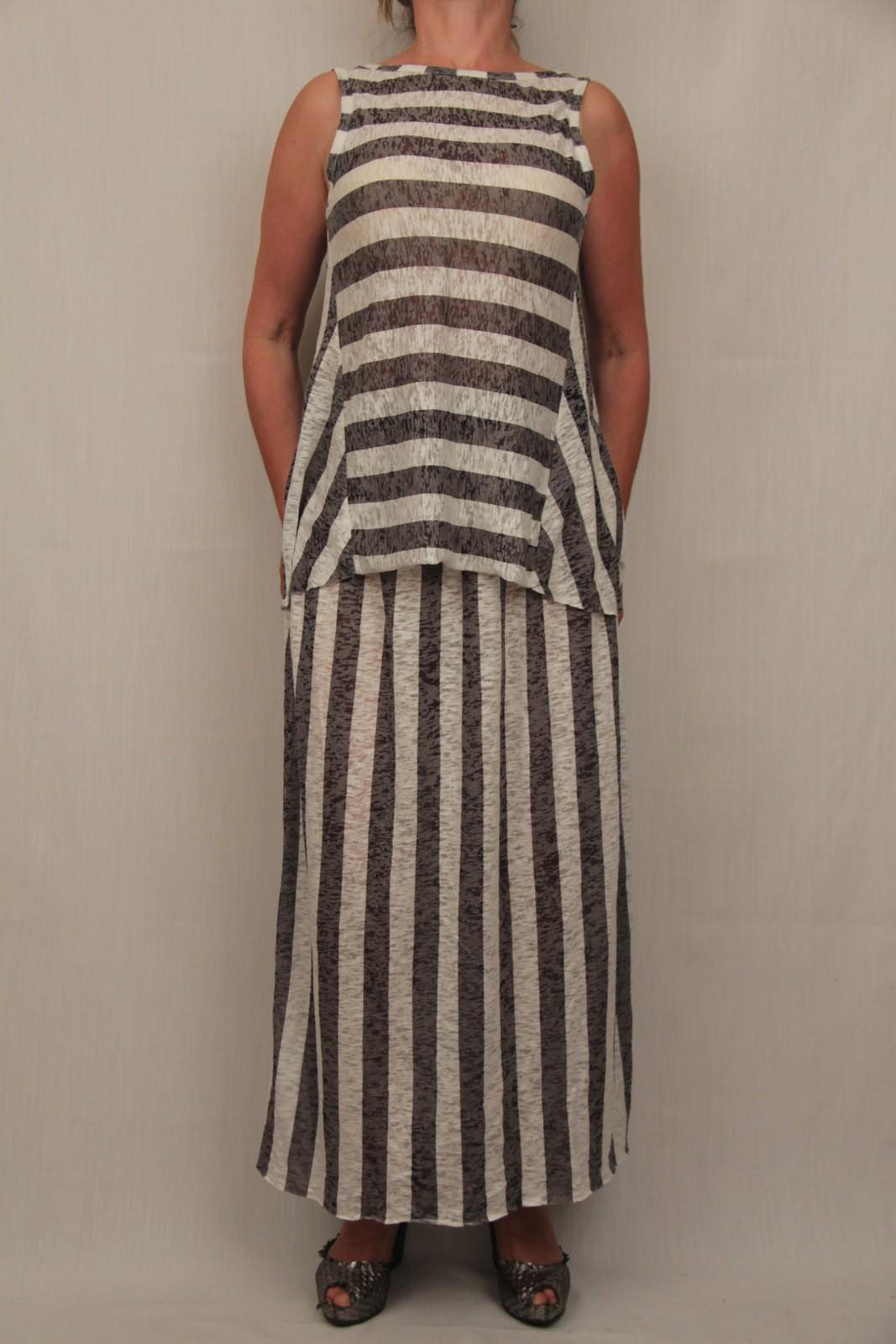 Юбка в серую широкую полоску. Юбка слегка просвечивает, по этому одеваем на базу..или комплектуем с удлинённым верхом , который вы видите на фотографии.