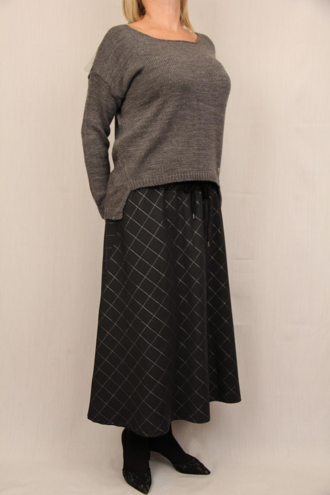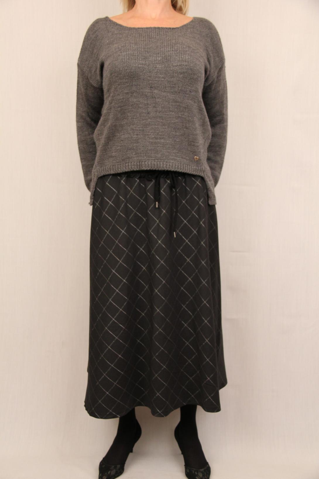 Оченнь модная и стильная юбка ниже колена с клеткой из люрекса. Пояс выполнен из эко кожи.