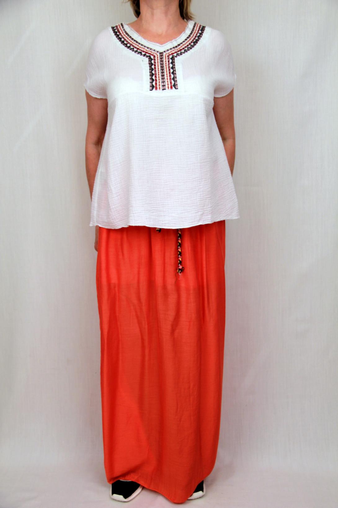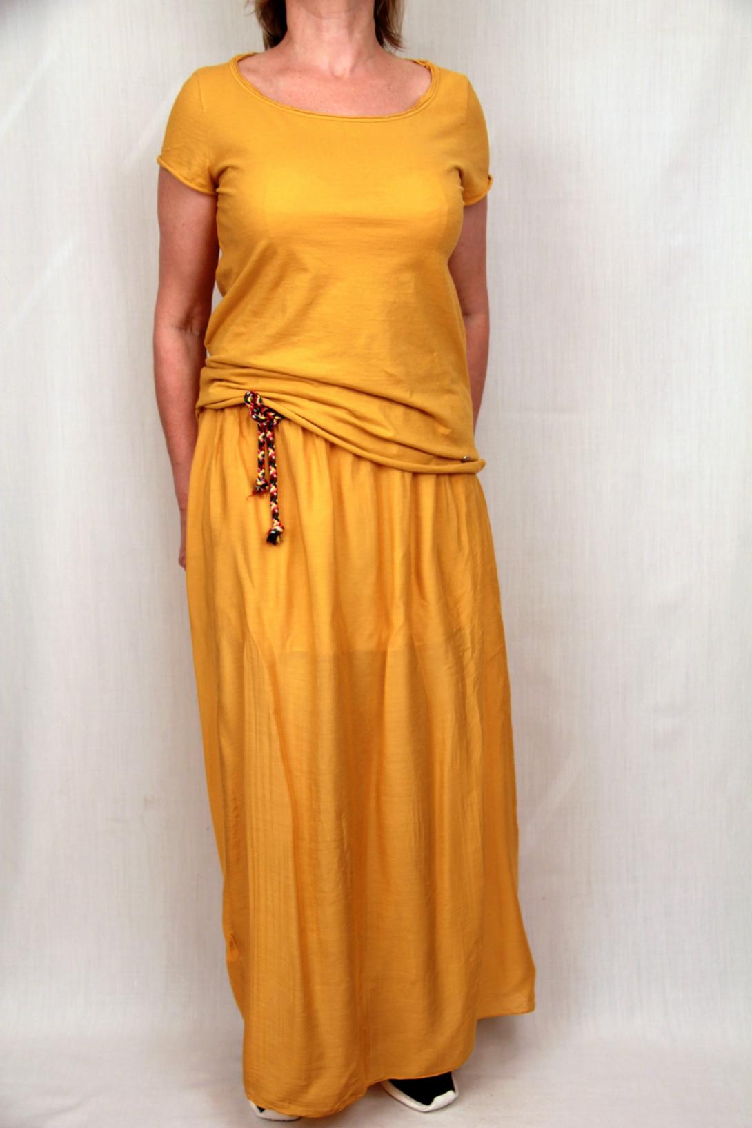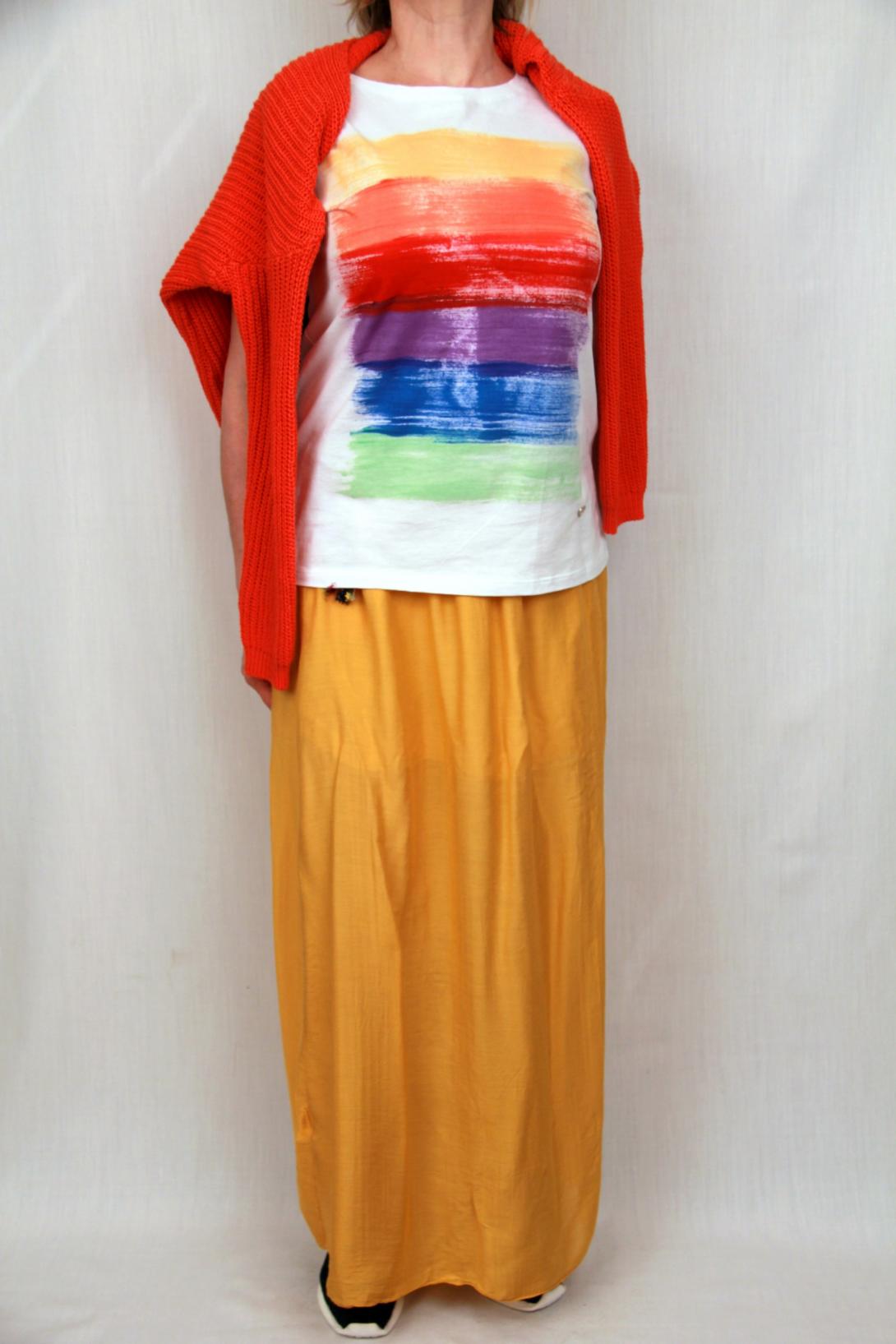 Юбка в "пол",легкая шелковая ткань, на подкладке.Подкладка у юбки до колена.Пояс на резинке, и разноцветном пояске.Длина юбки 95 см.