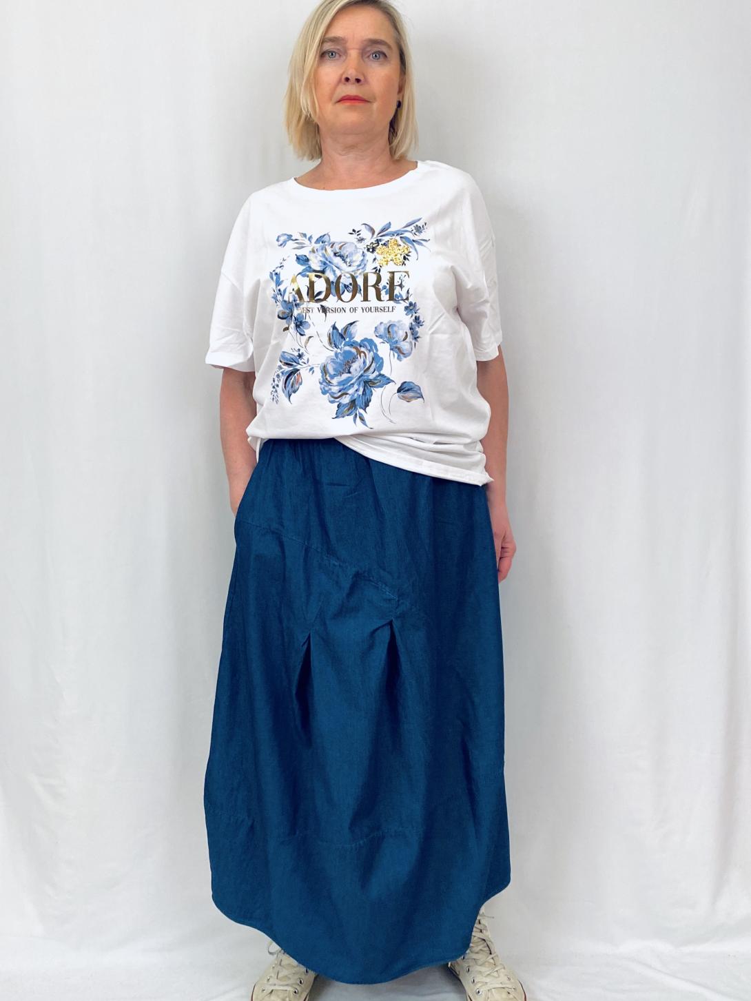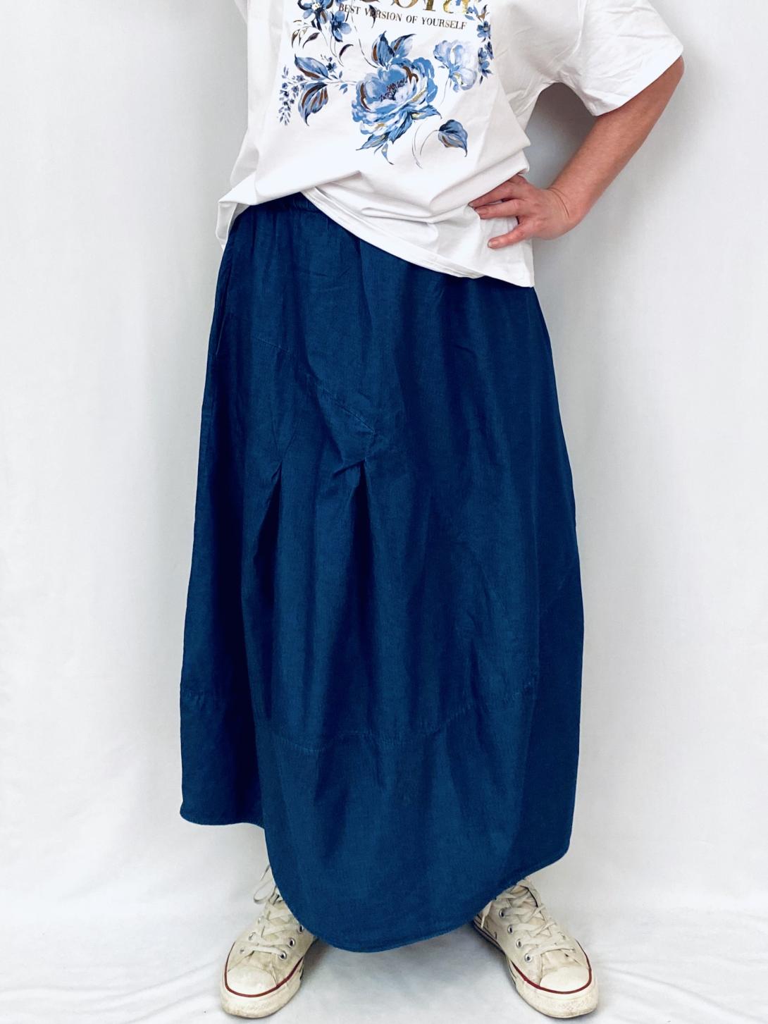 Тонкая джинсовая юбка баллон. Пояс комфортный на резинке, есть шлицы для ремня.